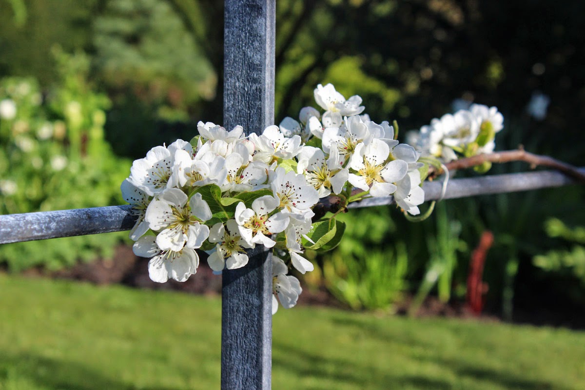 Close up of pear blossom on the new espalier arch which leads into the orchard. The frames with their newly trained trees have only been in a month but are already a hit with visitors.