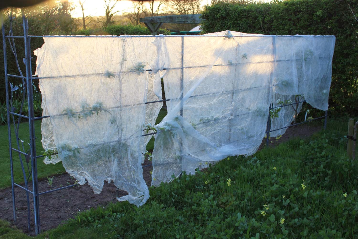 And the last job of the day - draping fleece over the newly opened pear blossom on the espaliers, which lent the garden a ghostly glow in the setting sun. Fingers crossed it's a precaution they don't need...