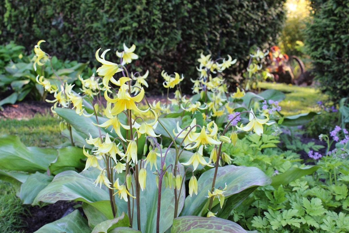Erythronium 'Pagoda' in the spring borders near the entrance. Just behind it, Chaerophyllum hirsuitum 'Roseum' which will soon take over the show.