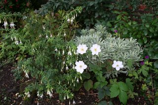 In the meantime there's plenty still to enjoy today. Euphorbia 'Silver Swan', Anemone 'Honorine Jobert' and a white fuchsia do a great job of lighting up the border under the birch tree. Anthemis tinctoria 'E.C. Buxton' looks oddly out of season with its primrose yellow flowers but still looks as good in October as it did in June. Helianthus salicifolia is a patient plant, waiting until the very last moment to flower. I love its fireworks-like soft green foliage - not so sure I'm going to like the flowers though but we'll see.