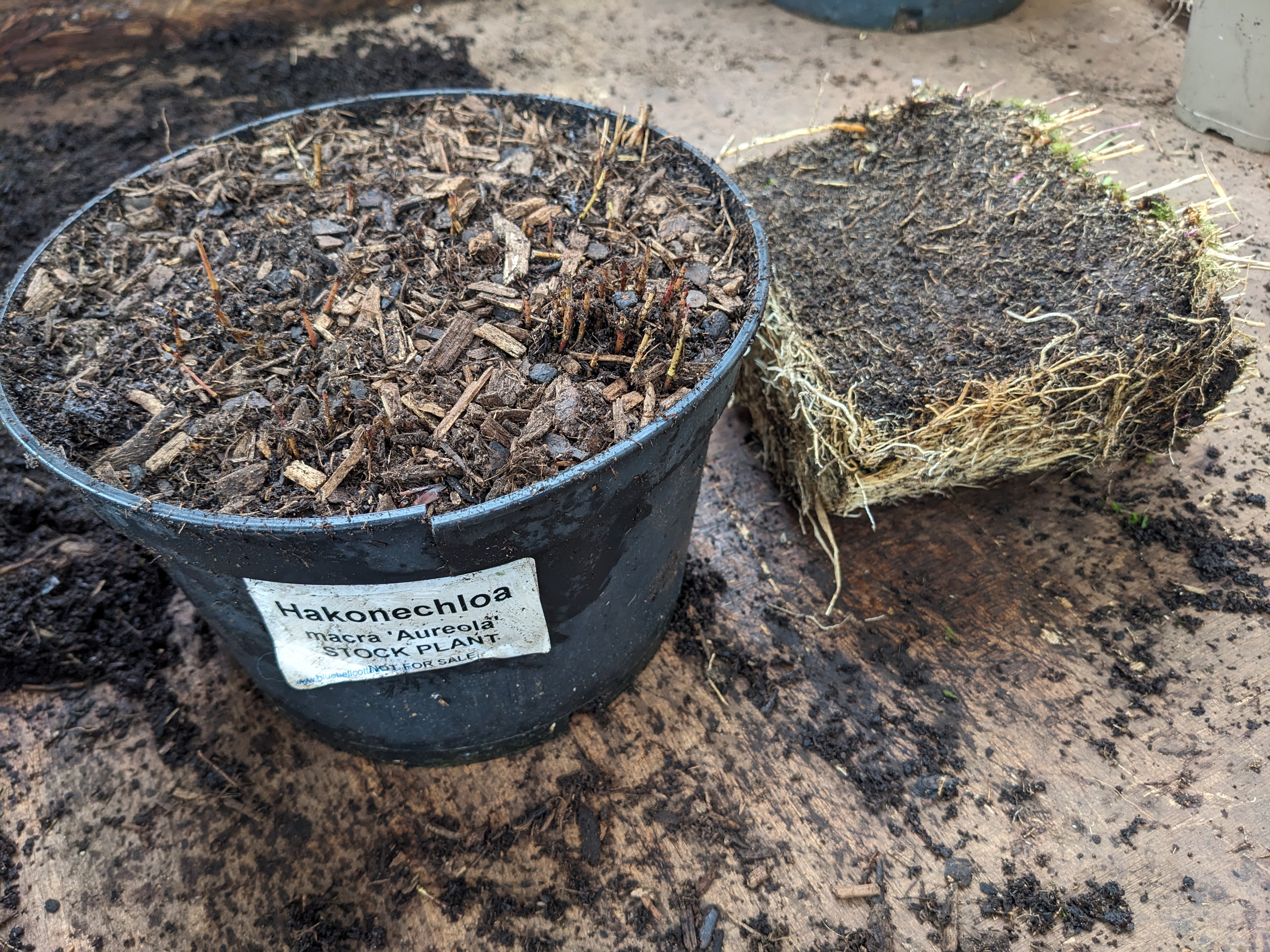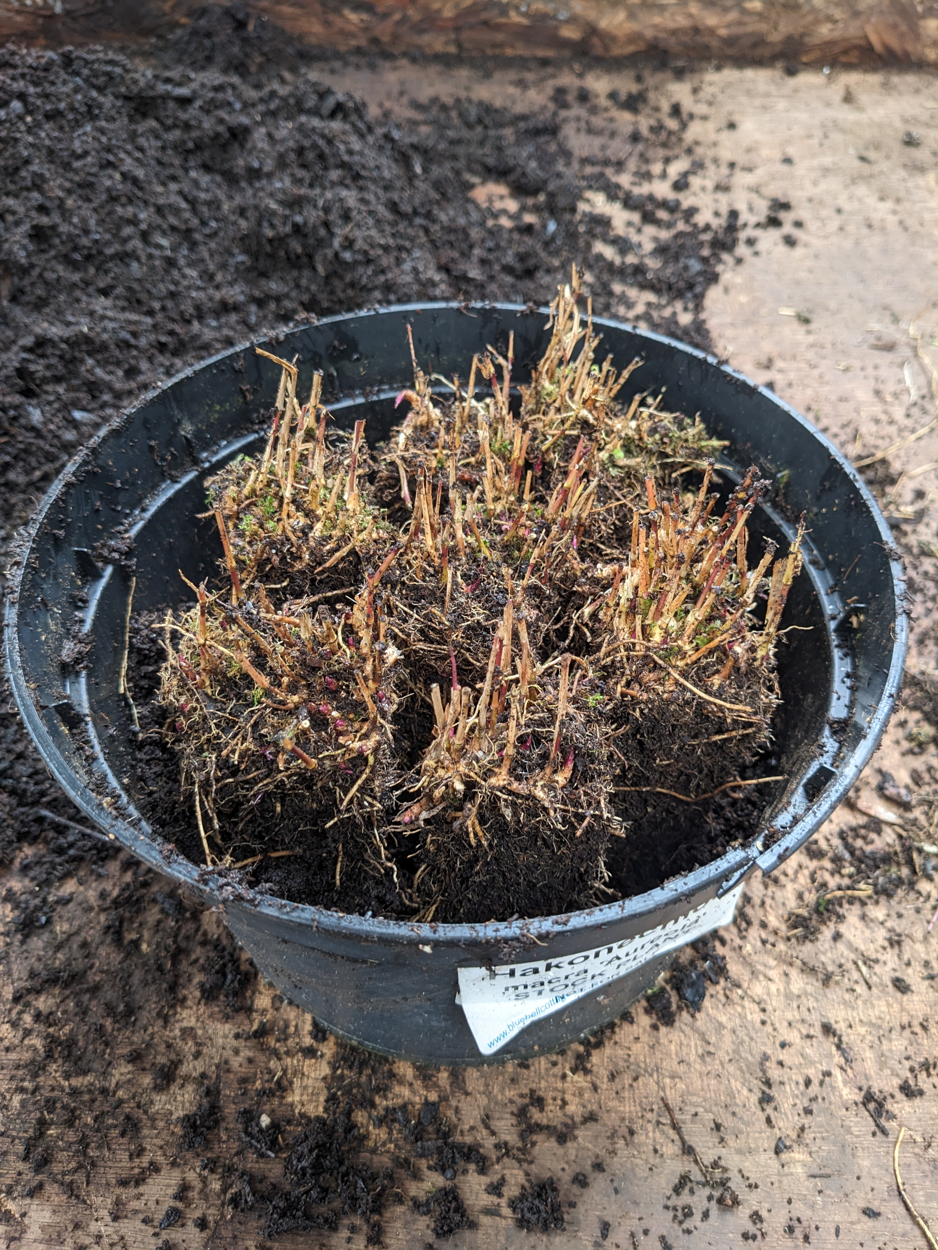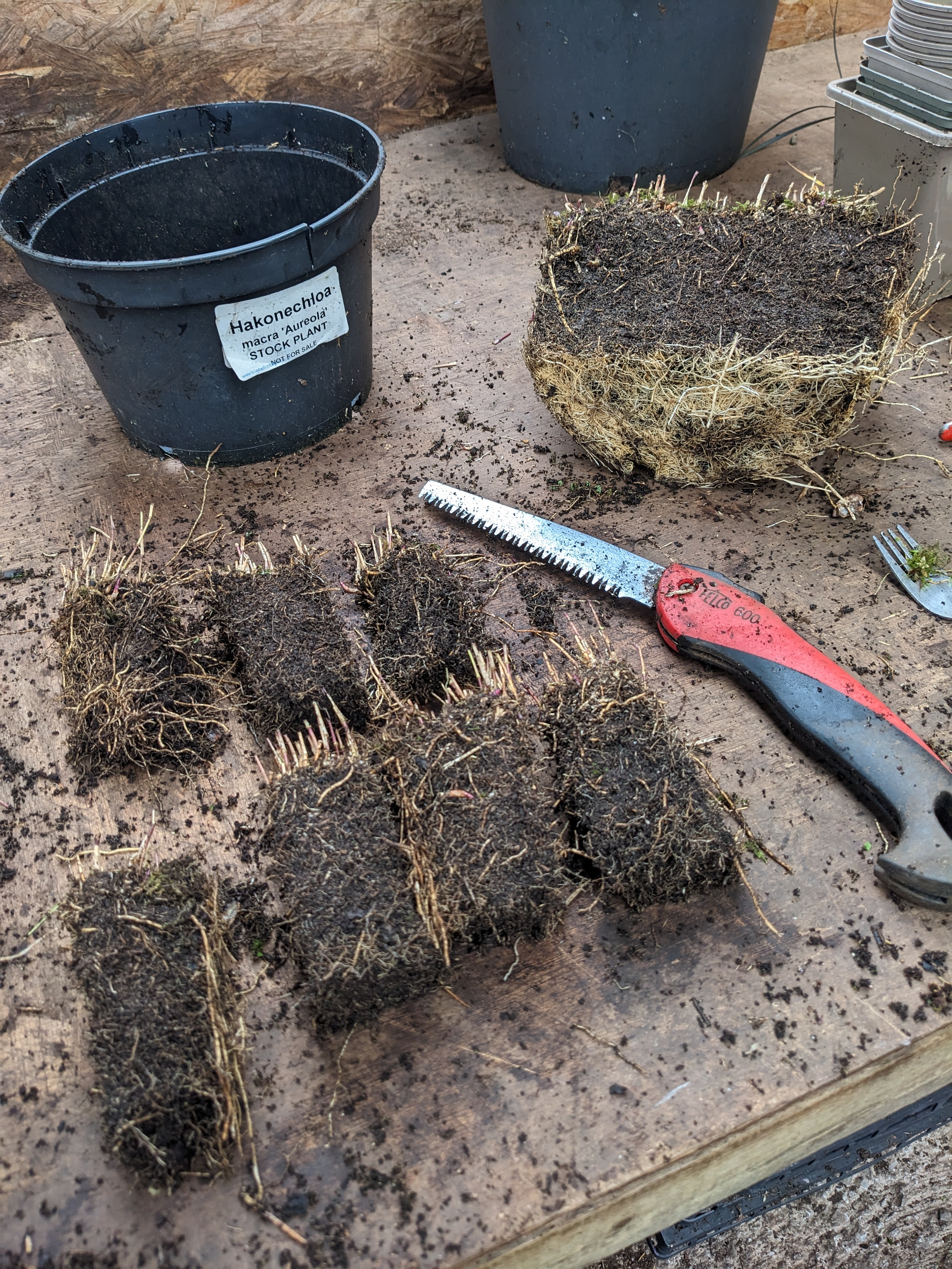 And so we turn our focus to quiet, steady plant production, lifting plants from the garden to re-invigorate them and to produce stock for next year. Some of the plants we have used for our show displays are ageing too and in need of refreshing, like this Hakonechloa macra ‘Aurola’.