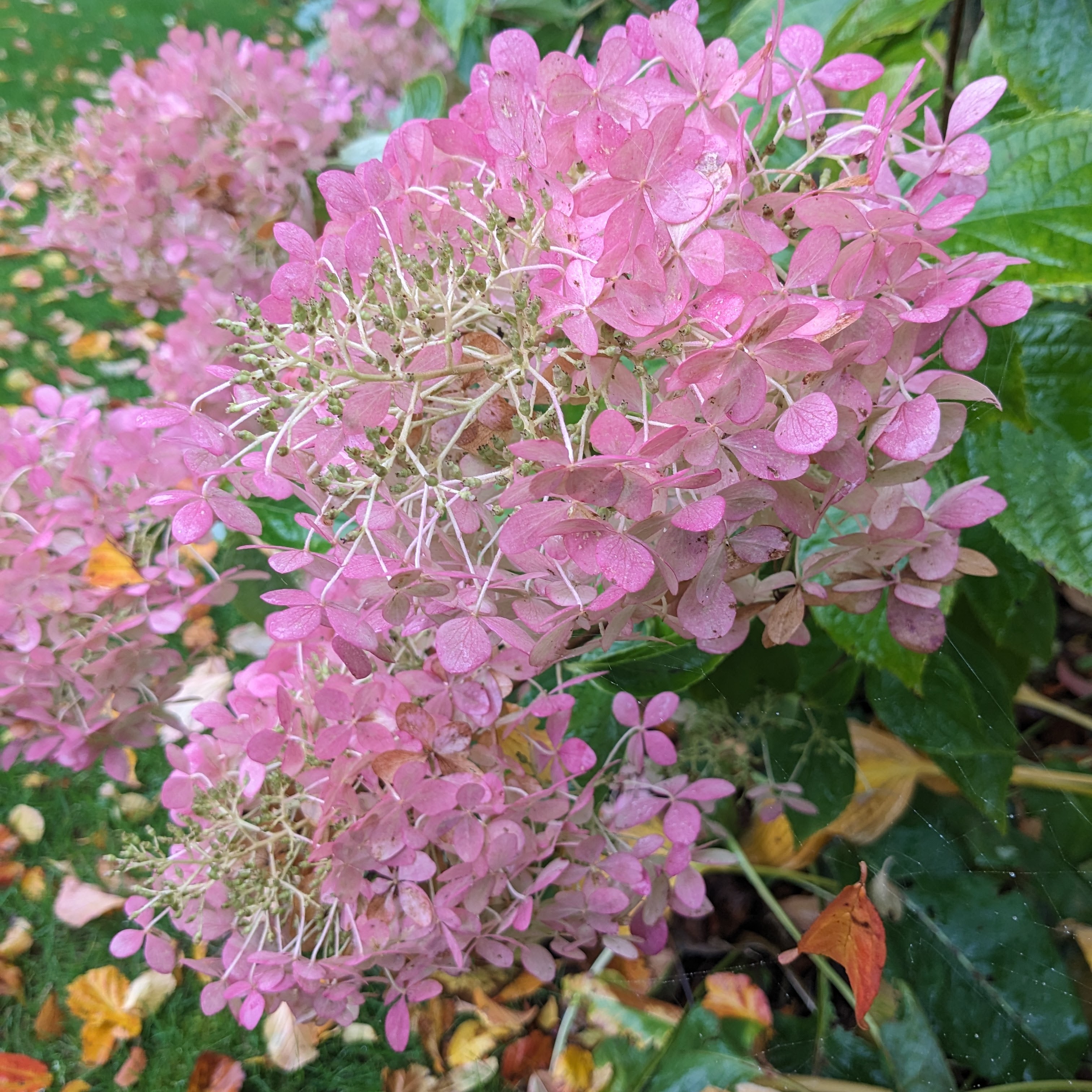 From the top, reading left to right: Aster ‘Winston Churchill, Canna - possibly ‘Wyoming’, Persicaria affinis ‘Superba’, Geranium wlassovianum leaf, Helenium ‘Sahin’s Early Flowerer’, Aster ‘Acturus’, Hydrangea ‘Limelight’, Cyclamen hederifolium, Salvia ‘Naomi Tree’.