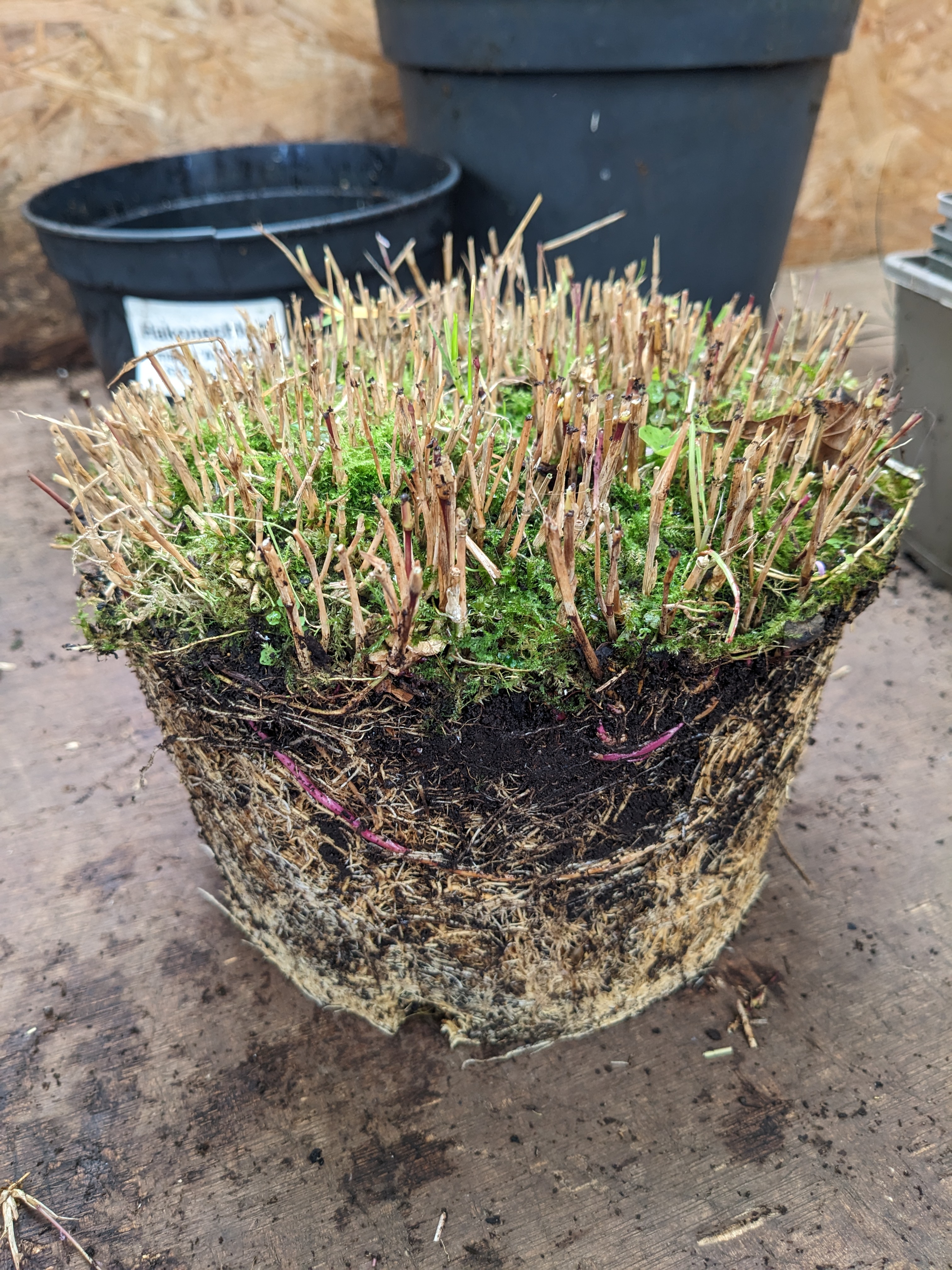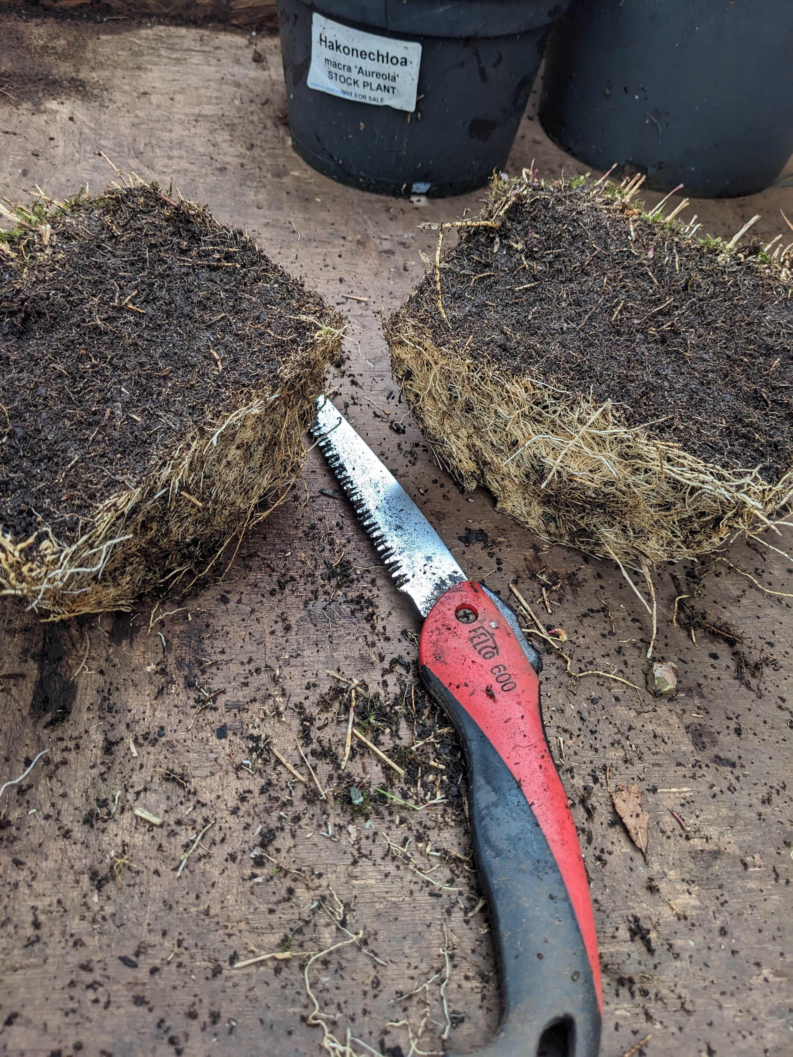 The plant looks alright at first sight, but the centre of the rootball is like concrete and it’s full of moss - it won’t produce a fine display on our stands next year. So this is what we do - saw off the bottom two inches, saw it in half and then into pieces. It looks brutal, but it opens up the plant and encourages new root and shoot growth in the centre. Here we’ve used about half of the old plant to produce a new show plant and the other half will make a dozen or so new plants for stock too.