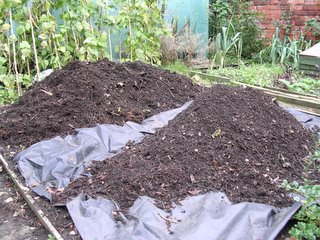 The pile on the right is 2 year old leaf mould. The left hand pile is 18 month old compost. Apart from the sticks in the compost and bluebell bulbs in the leaf mould, both are perfect - soft, dark and crumbly. The bins are now clear and ready for re-filling. All in all a very satisfying days work.