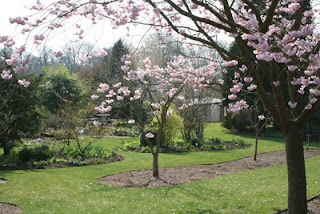 It's been a while since I posted a picture of the garden and the cherry tree inspired me. Most of the blossom is now on the lawn, but it still looks pretty whether on the tree or the ground. The tree is a magnet for bumblebees - there's a mesmeric hum all around it - and the bare soil underneath it is now covered in little hills with a neat hole in the top - some sort of miner bee I guess.