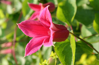 This stunning, tulip shaped clematis is 'Princess Diana' and is growing up an apple tree in the orchard.