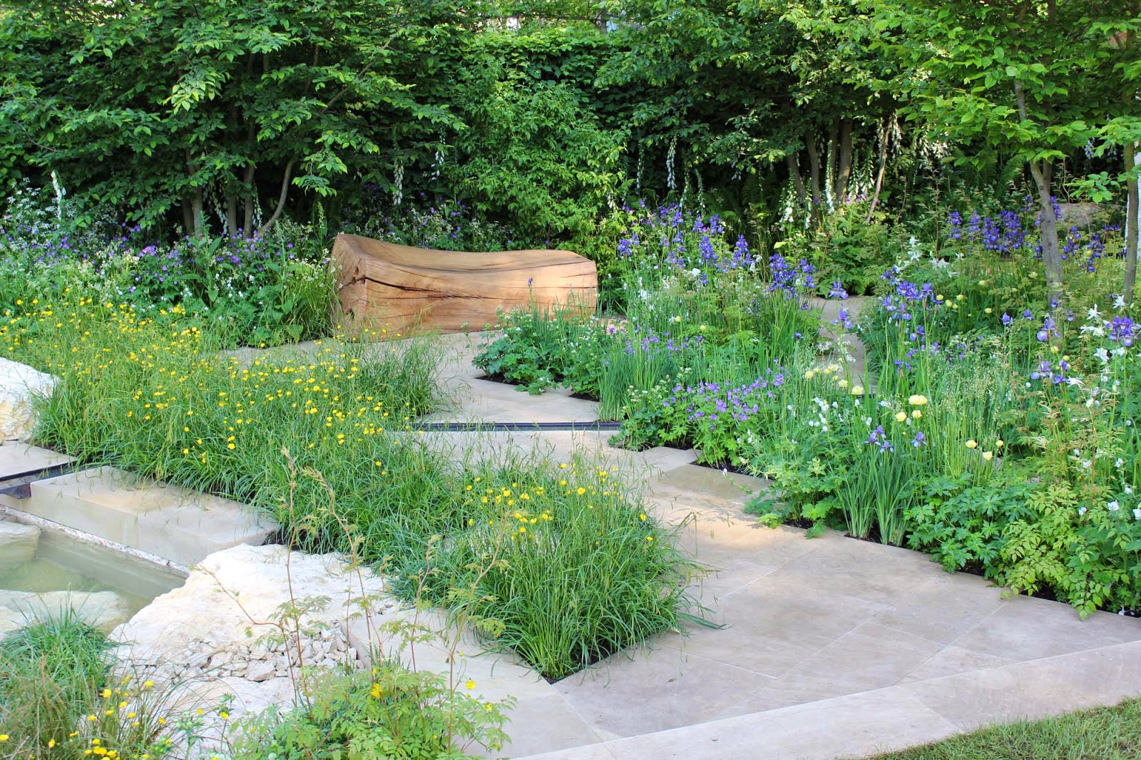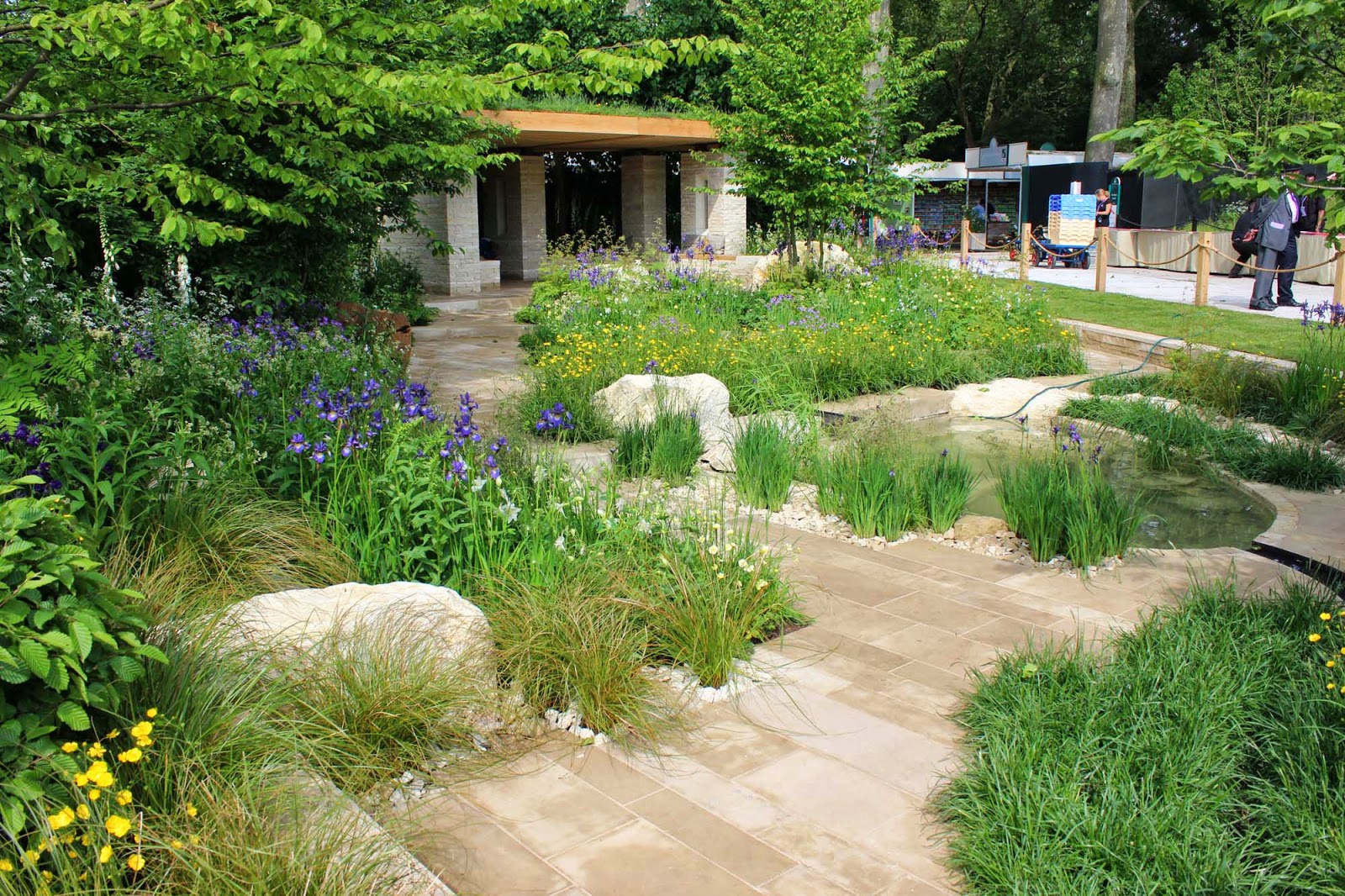 I rather liked the Homebase garden 'A Time to Reflect' for the Alzheimer's Society, with its multiple paths, open planting, gorgeously curvaceous wooden benches and shady, well proportioned pavillion. All the stone was the same colour, but with different textures: smooth paving, walling, natural rocks and gravel.