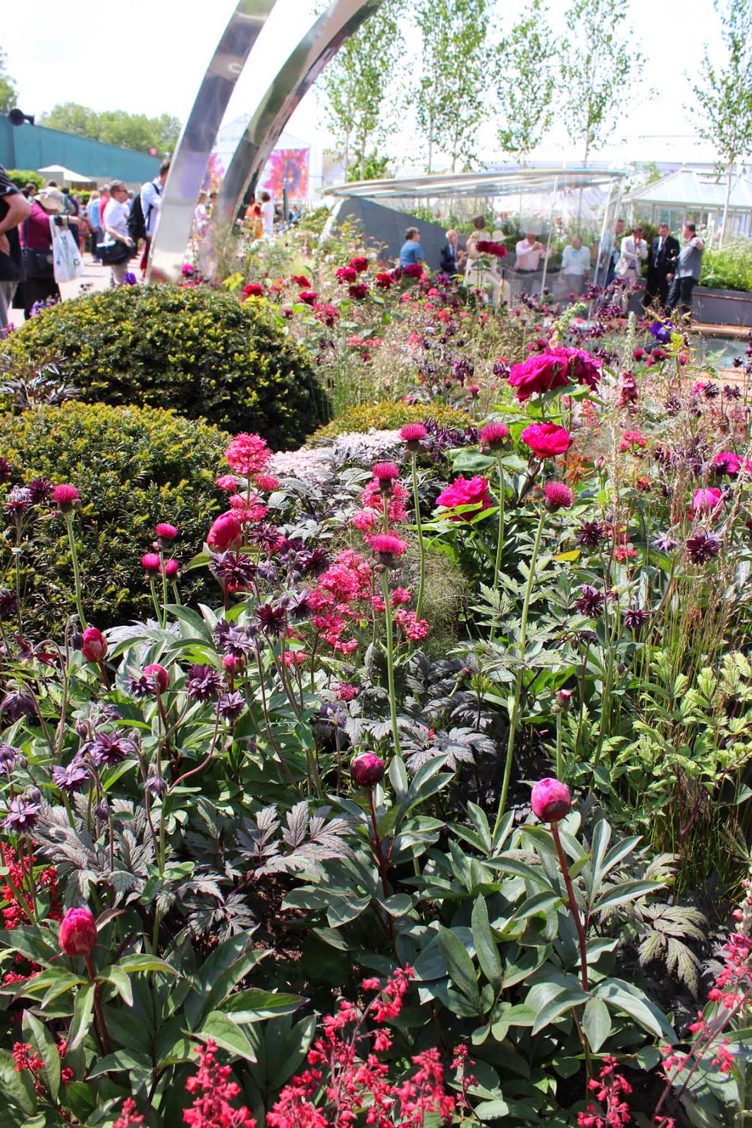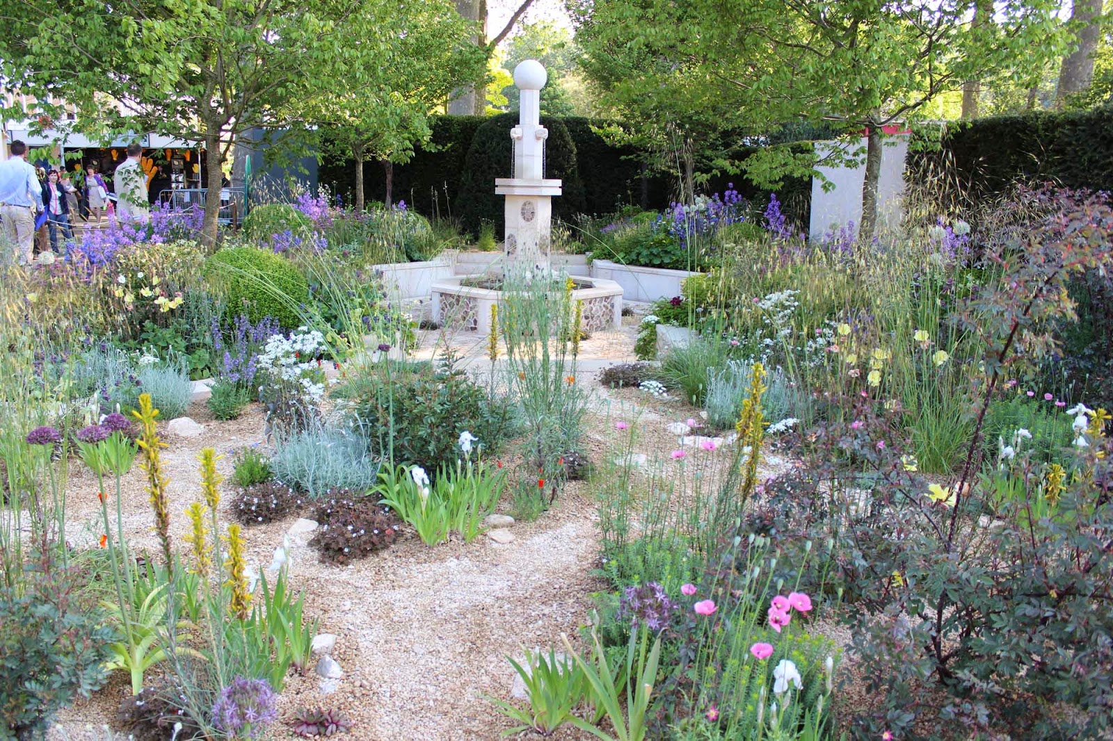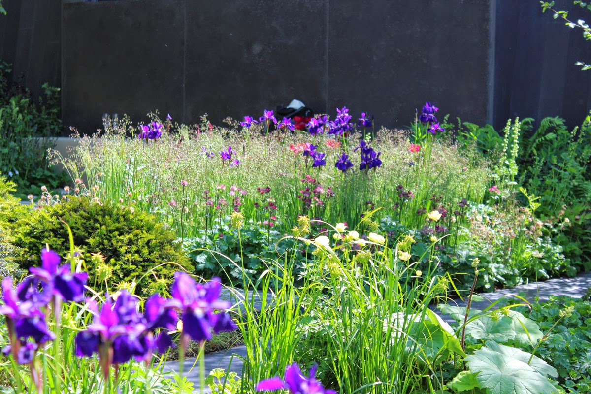 I started with the best of intentions - a careful study of each show garden, camera and notebook in hand. A couple of so called 'celebs' caught my eye, but it was easy to resist pausing to photograph a somewhat plump and orange Lawrence Llewellyn Bowen and a heavily made up Gloria Honeyford. I focused on the task in hand and admired Cleve West's restrained planting on his Persian-inspired Paradise Garden. I love that he leaves space for plants to express themselves individually, avoiding that Chelsea-esque style of packing plants in improbably close. I love the asymmetry of the foreground planting and the subtle colour combination of Stipa gigantea with Asphodeline lutea. The overall effect is a delicate, airy tapestry.