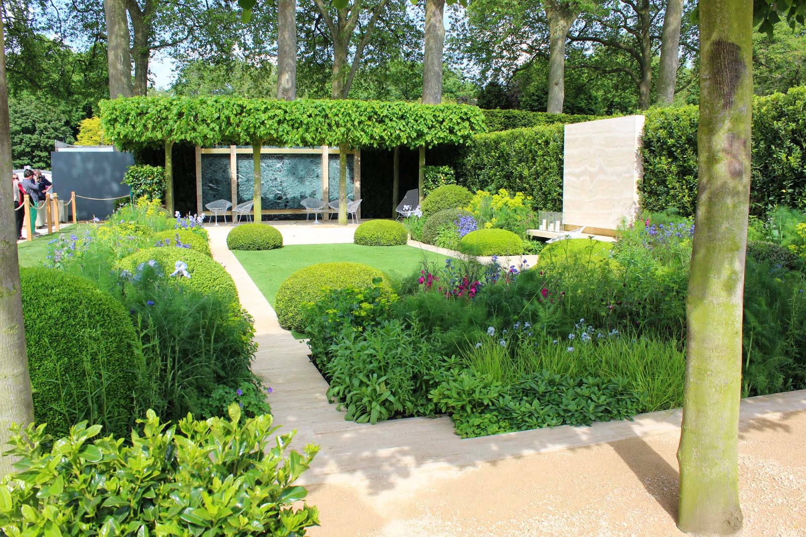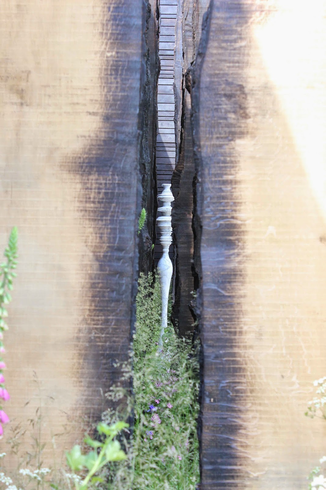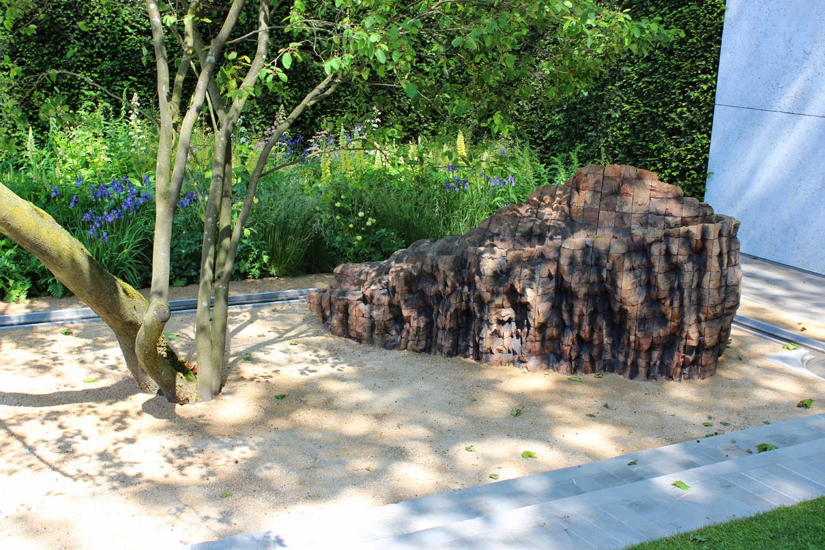 And along the back of the garden, vertical blackened tree sections, as if struck by lightning framed this lovely sculpture in one of the most striking images of the show. Apparently the sculpture represented the wave form of the word 'light' spoken. I'd like to have read the brief to understand how it all interconnected - the choice of plants, the graded colours, the blackened wood and the sculpture. And the amateur photographer in me rued that I couldn't quite see the whole form of the sculpture through the narrow gap. But no matter, the overall effect was gorgeous and it won a well-earned Silver-gilt medal.