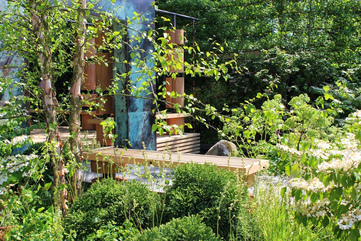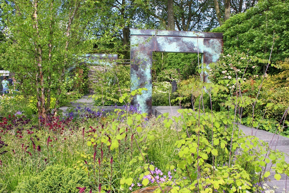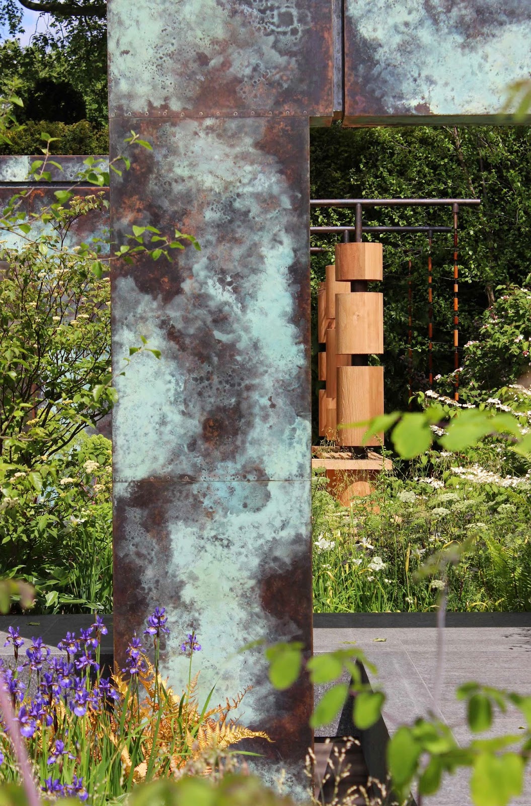 Cleve West's garden held top spot for me until Matthew Child's garden for Brewin Dolphin caught my eye. Those gorgeous square copper arches with their mottled green-tinted surfaces as if aged with lichen and the soft transparency of the planting had me quite bewitched. Every aspect revealed something different and the gentle colouring of the whole thing spoke of a masterful hand at work. See the way that foreground bronzy fern picks up the cedar columns in the background? Just one example. Overnight on Monday I tipped it for best in show.
