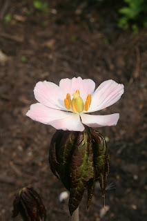 Other successful finds included Paris quadrifolia (I have sown some seeds but can't wait), Podophyllum peltatum and Meconopsis x sheldonii 'Slieve Donard'. The podyphyllum is destined for an area which already has Podophyllum hexandrum var. chinense and Arisaema consanguineum, so I thought I'd turn this spot into a little collection of the weird and wonderful. Here's my Podophyllum hexandrum in all its brief flowering glory in the garden. And the Arisaema has survived the cold winter and is throwing up new shoots - yippee!