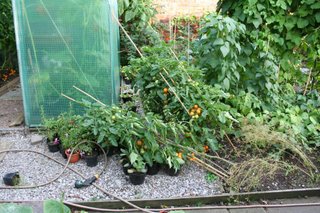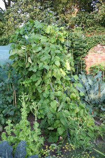 I've been busy with work and away a lot lately. The grass is three inches high (but green at last) and several taller plants have toppled for lack of support. But if you don't look too closely, the overall effect in the garden is one of lushness. I love this garden in September. Several plants have begun to pick up their autumn tints and with the sedums, fuchsias, and crocosmias in flower the borders are suffused with a warm glow of colour. But I'm not taking any border pictures until I've tidied up a bit - below are a couple of casualties in the veg plot.
