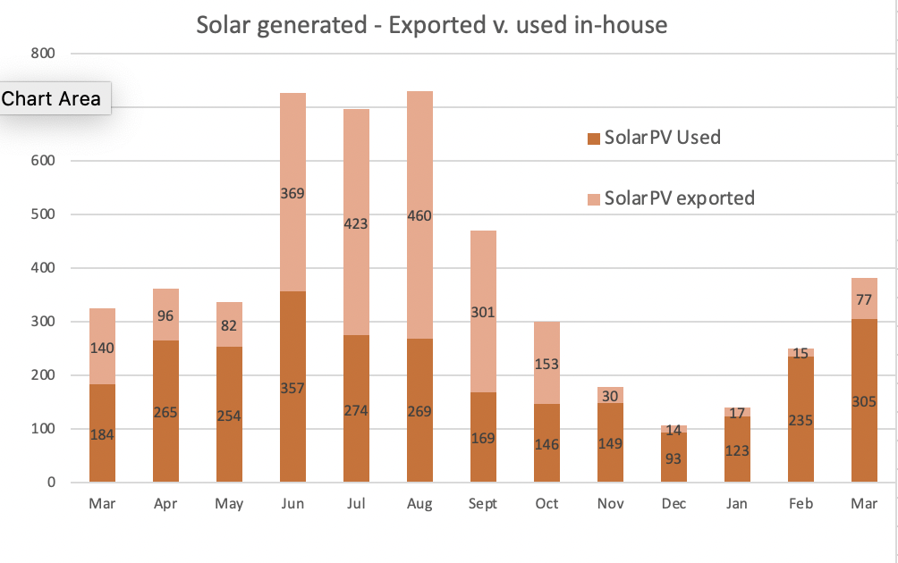 You can see from above that last summer I exported around half of my total generation after I added the new garage panels in June. In effect, all I’d achieved was generating more and exporting it all to the grid each day. But once I added the batteries in November (13kWhr capacity - roughly enough to last a day) I was able to store and use a much higher proportion of my own electricity.