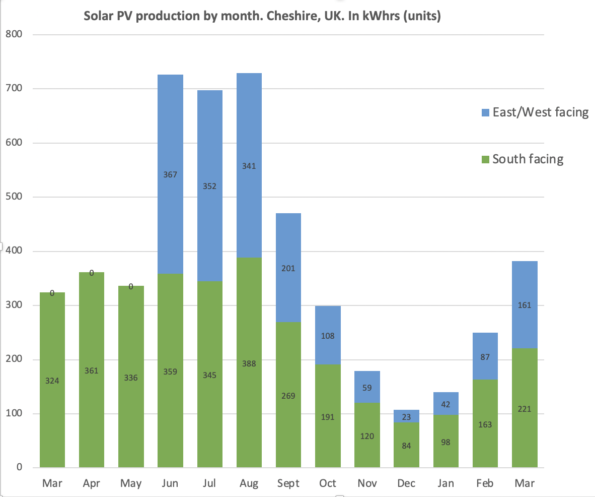 The East/West facing ones were installed in June 2022 and have a maximum output of 3.2kWhrs, but this never happens in practice, because they are split 50/50 each side of the garage roof. It’s impossible for the sun to shine directly on both sides at the same time. But the east facing ones start generating early in the day and the west facing ones keep going till sunset. And they are new, highly efficient panels which work well from indirect light reflected from the sky. As you can see above, in June and July last year they actually produced more than my south facing ones, which surprised me. In winter they are partly shaded by the house, so produce a lot less.