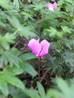 The first cyclamen of autumn, dressed in borrowed clothes from geranium striatum