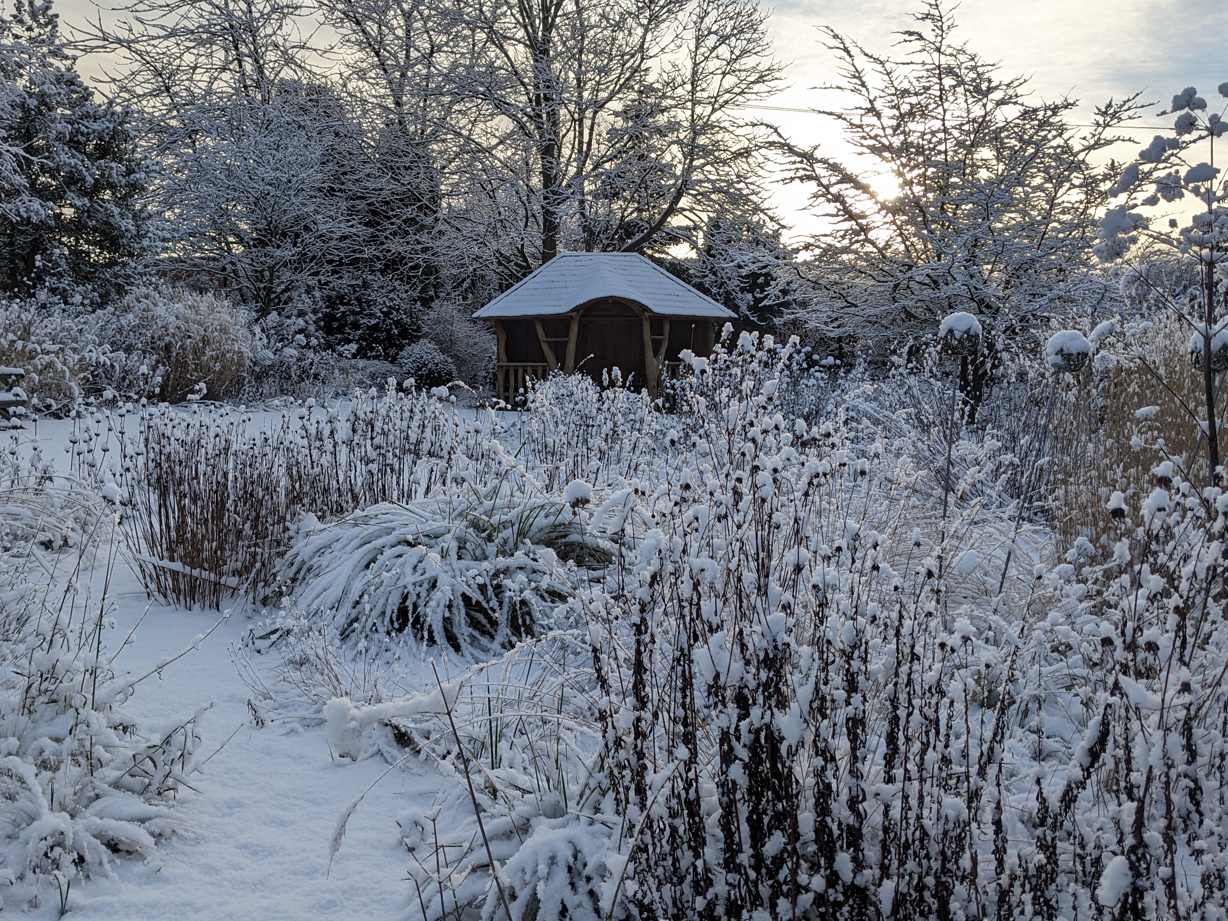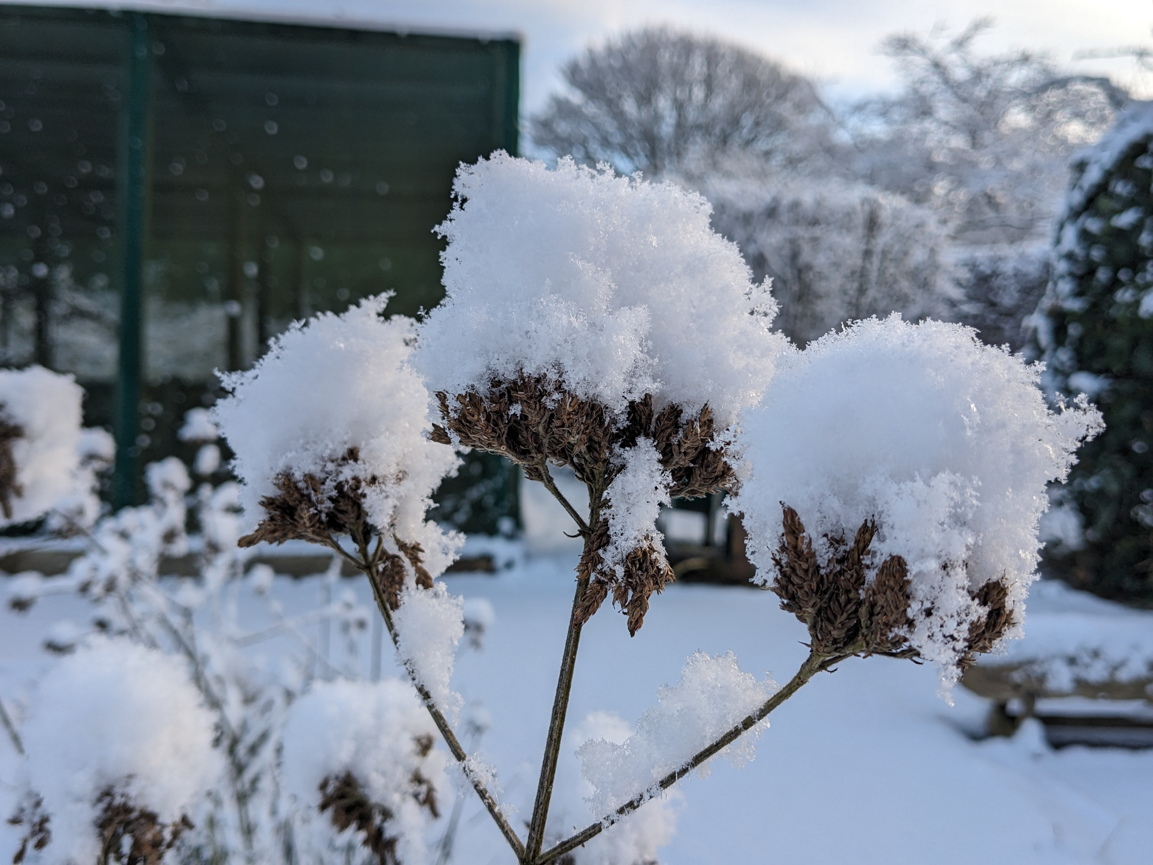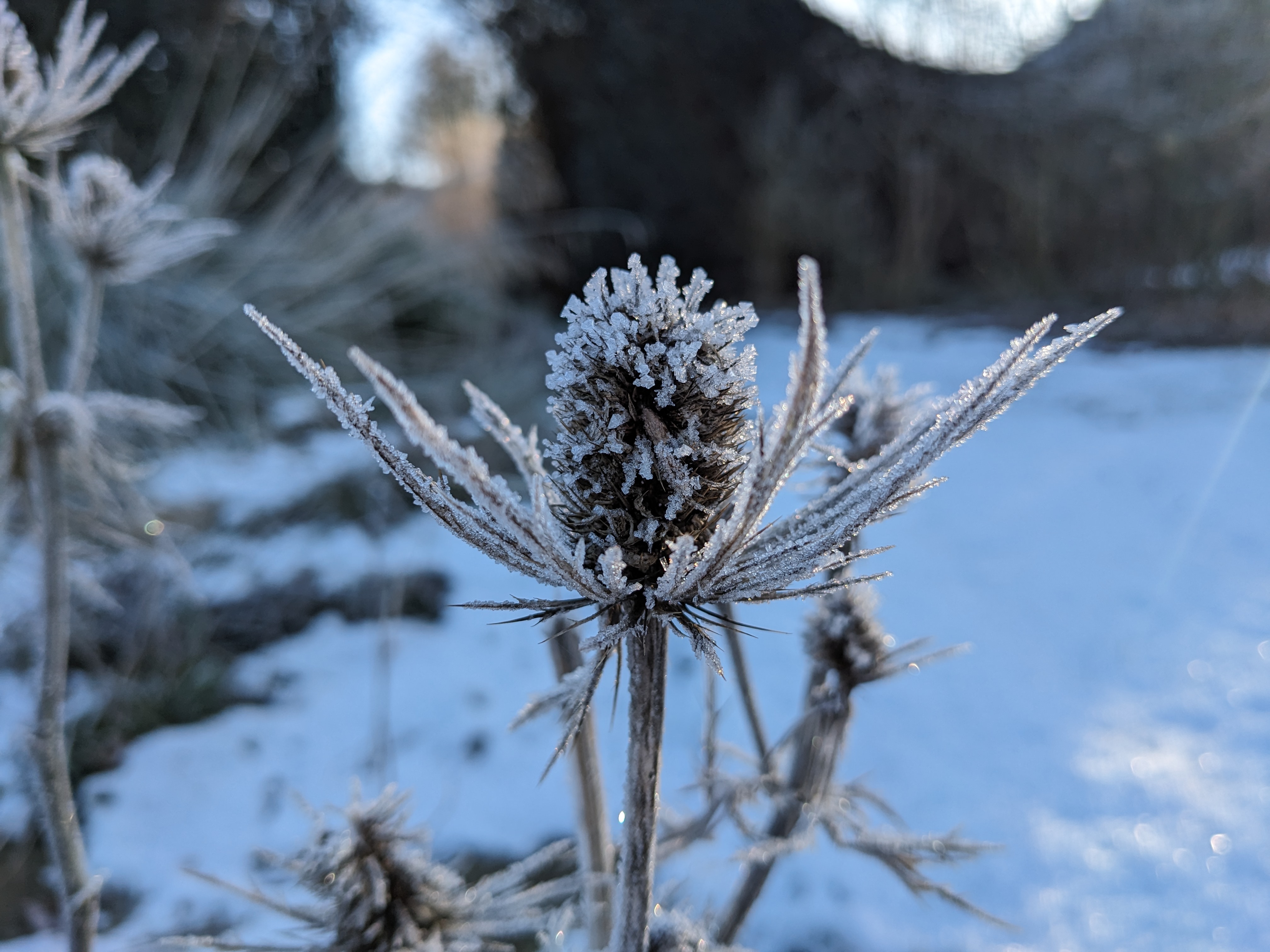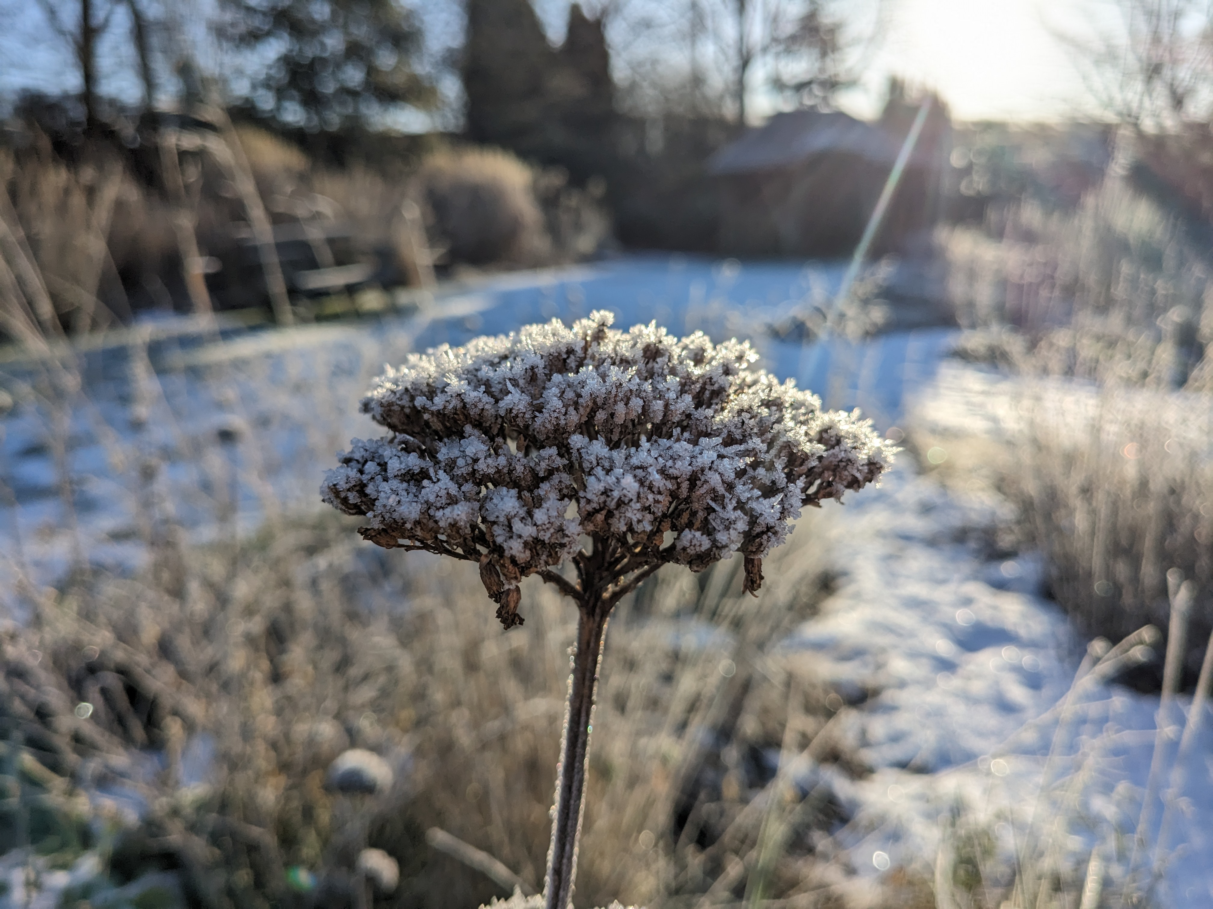 First though, winter must take its bite. Two inches of snow this week followed by a deep frost have halted the rising sap and buried the emerging shoots. We recorded minus 8 two nights ago and it is minus 5C outside now. It is beautiful while it lasts of course, especially when lit by brilliant sunshine as it was today, and we are handsomely rewarded for leaving most of our perennials uncut.