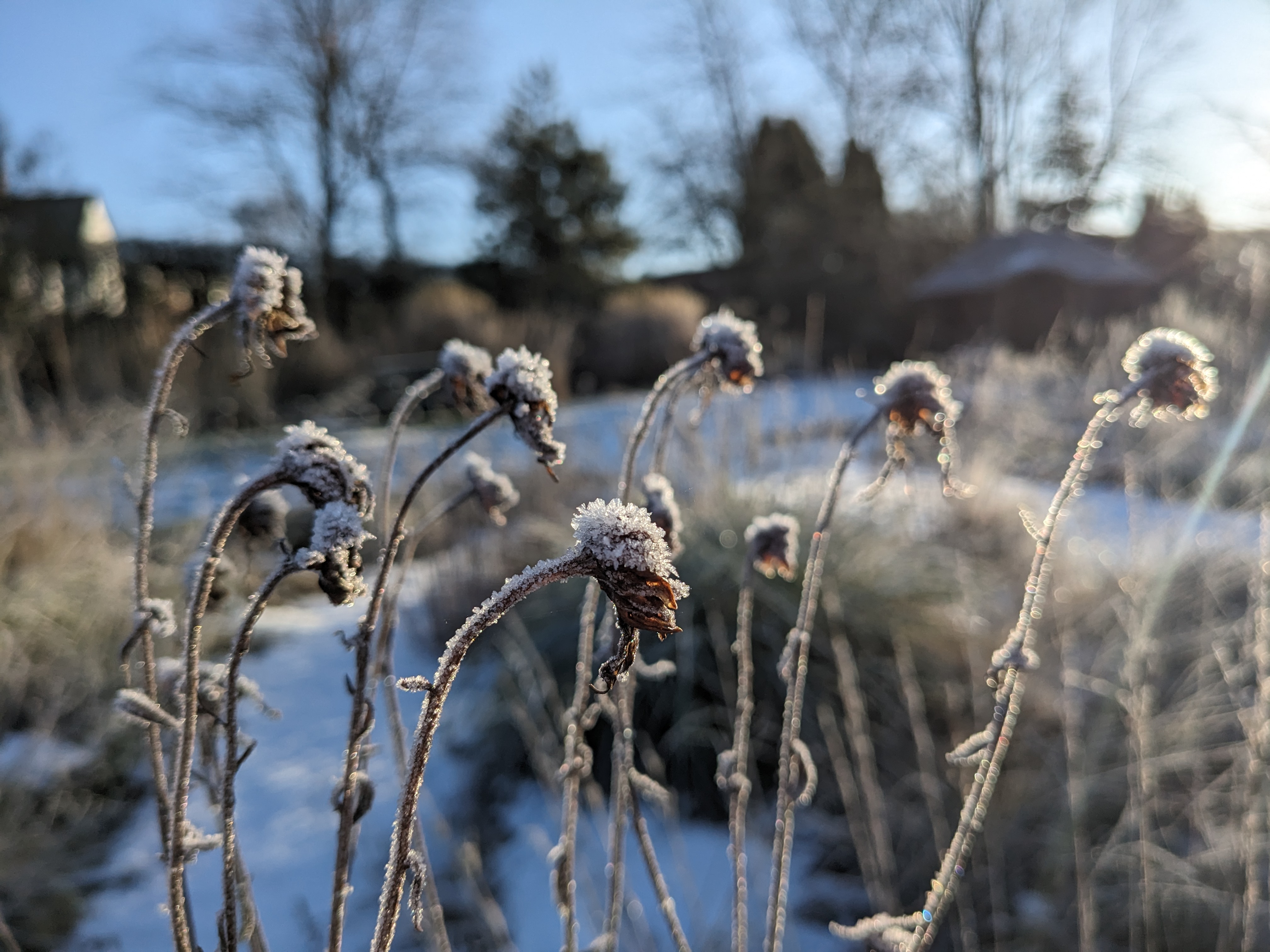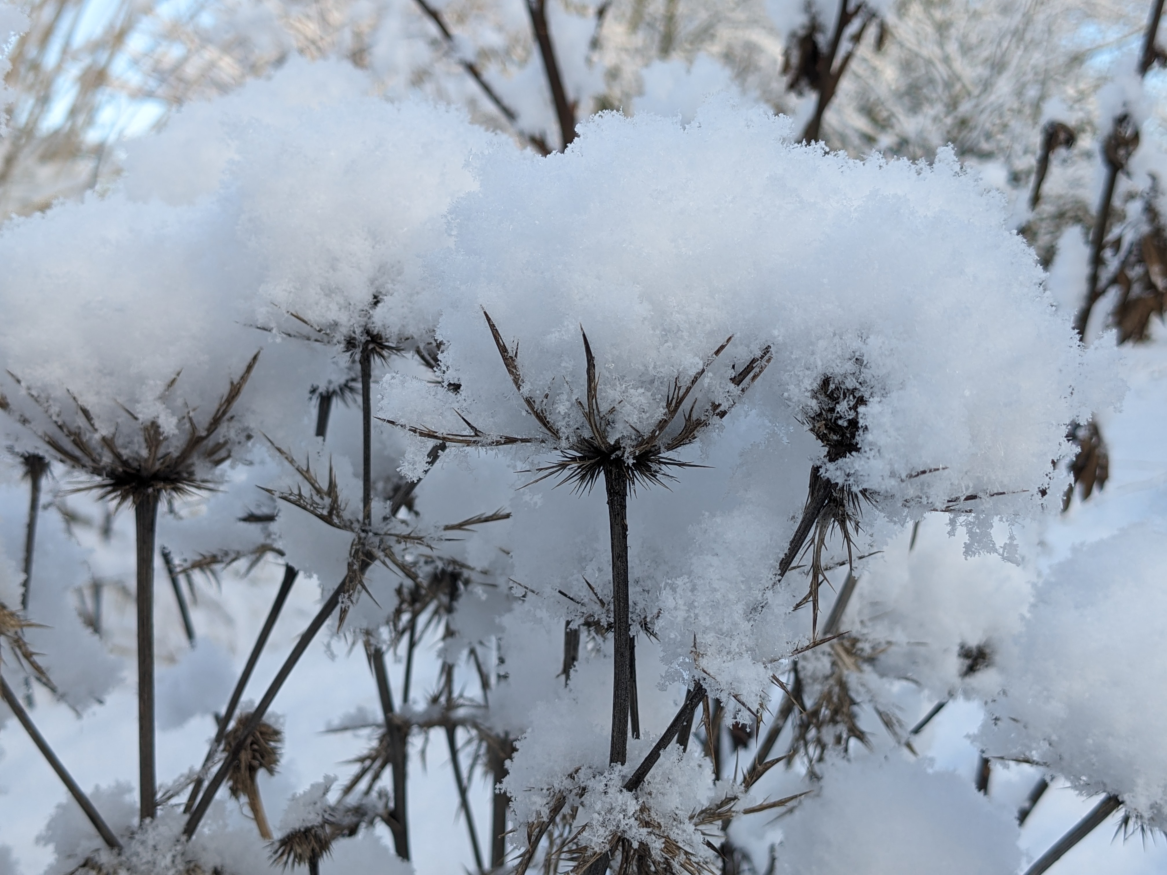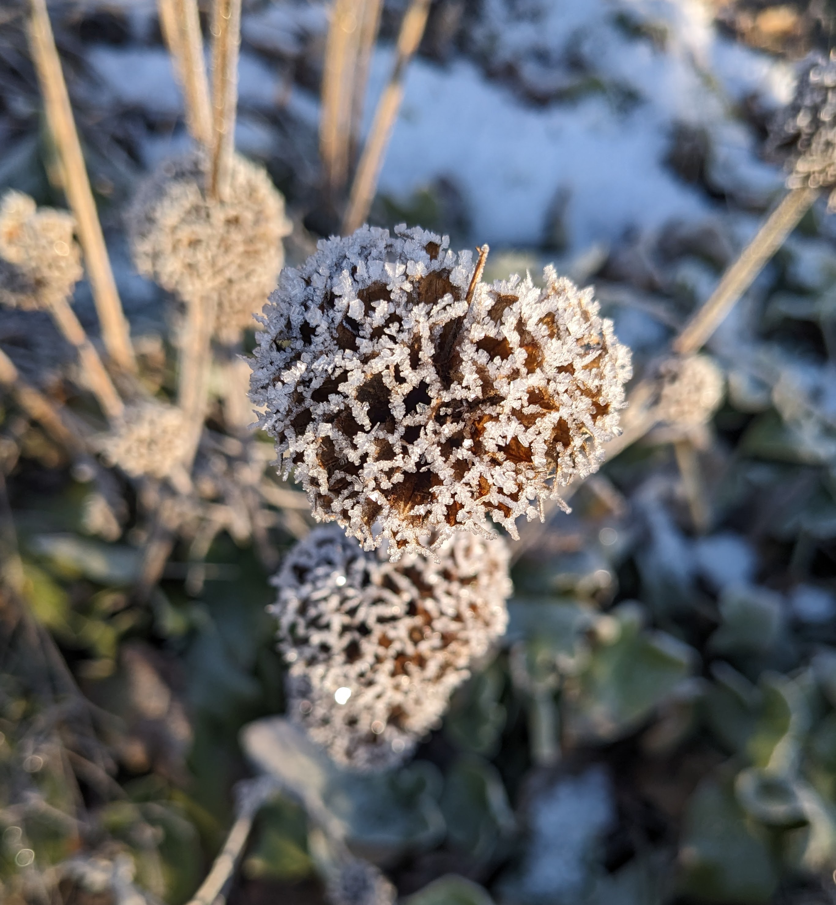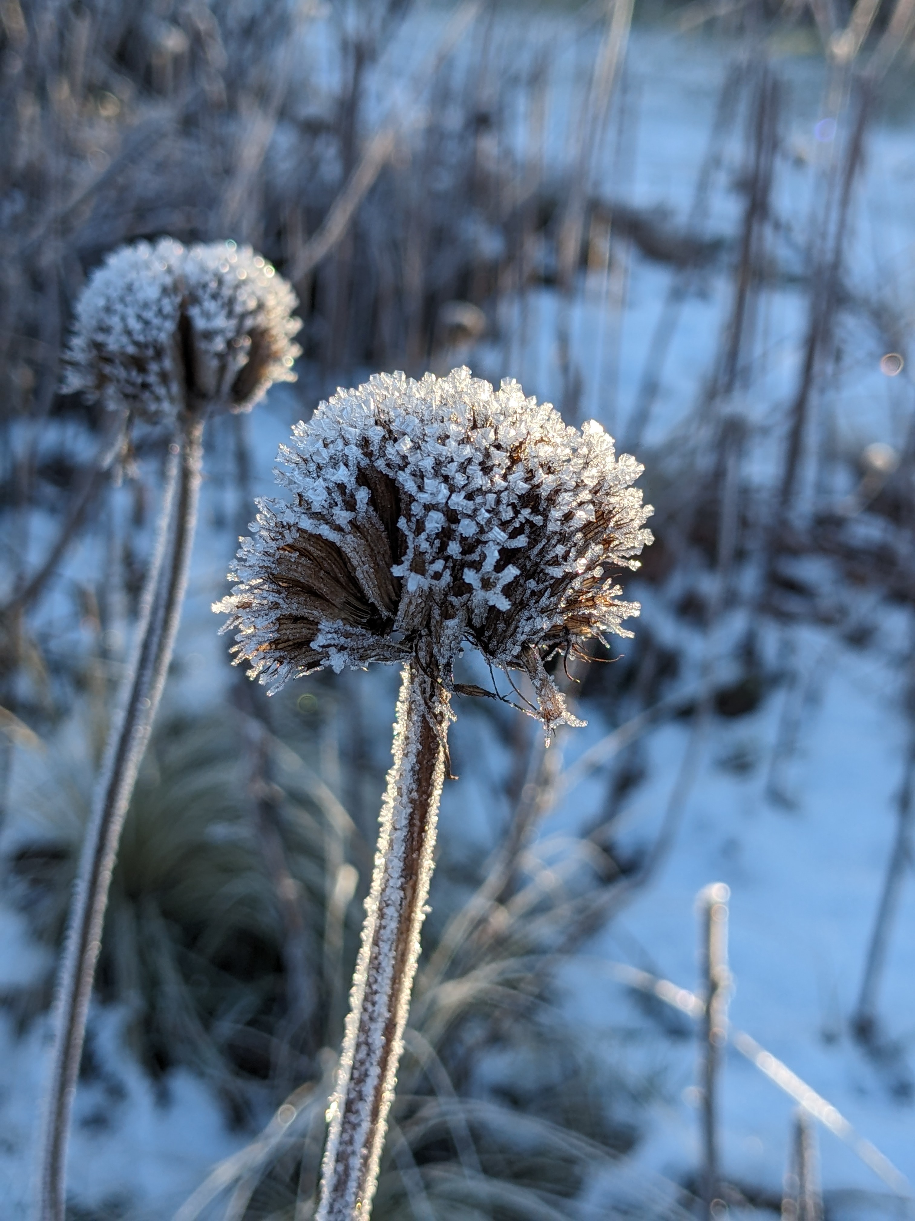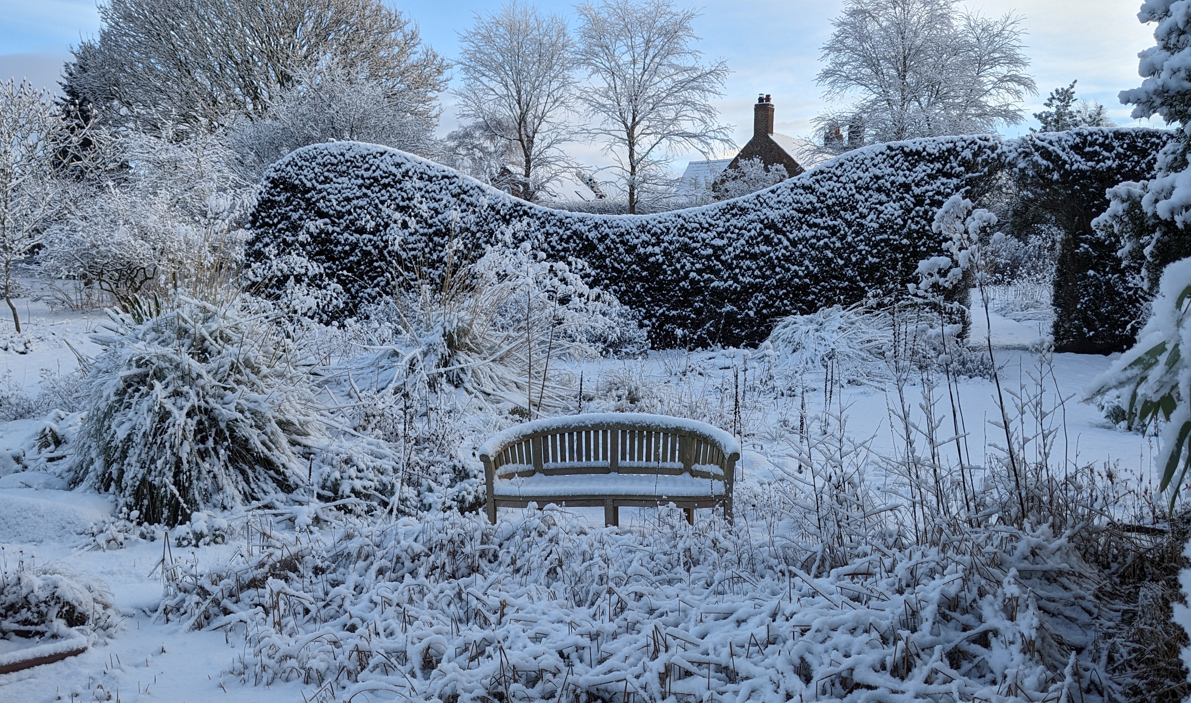 First though, winter must take its bite. Two inches of snow this week followed by a deep frost have halted the rising sap and buried the emerging shoots. We recorded minus 8 two nights ago and it is minus 5C outside now. It is beautiful while it lasts of course, especially when lit by brilliant sunshine as it was today, and we are handsomely rewarded for leaving most of our perennials uncut.