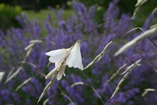 I've been rubbish at posting pictures lately, but I took a couple tonight. I planted out a random selection of Dieramas last year in the new beds. Delightfully, some have turned out to be white. They look divine against the blue Nepeta and the dark green yew hedge.