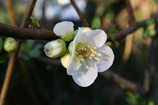 A white quince with its frost-proof flowers open in total disregard of the sub-zero temperature