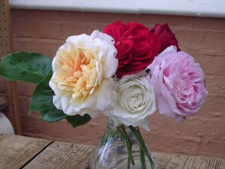 I think these are (clockwise from L) David Austin's Evelyn, The Times, Dublin Bay, another David Austin but I'm not sure which one, and my climbing Iceberg. By the end of the day I hope to have added Mme Alfred Carriere for the new fence.