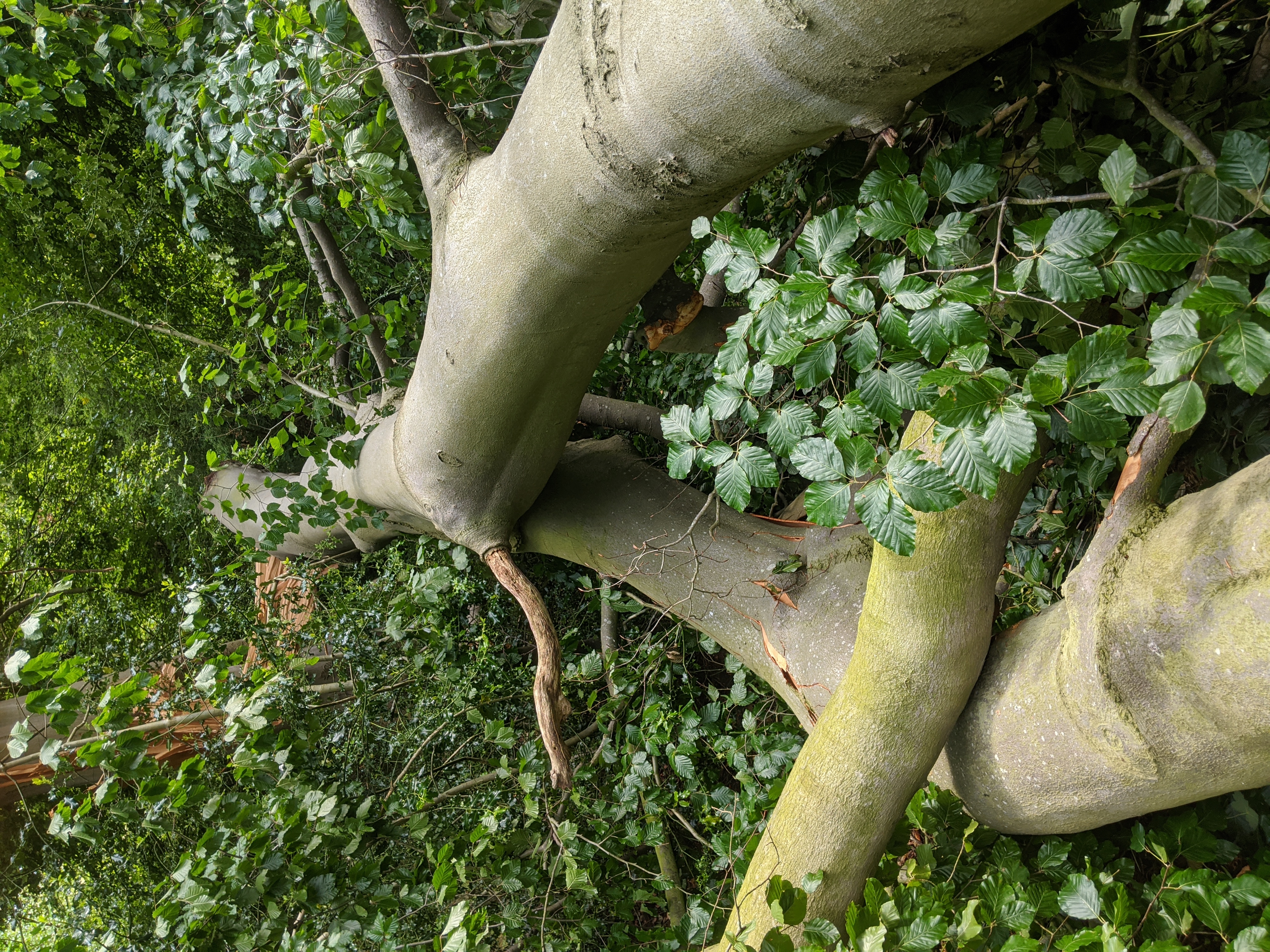 In its fall, it had ripped off the branch from its sister tree that had been wrapped round it, leaving the other wounded and bereft. It has no branches on the side where its sibling once lived.