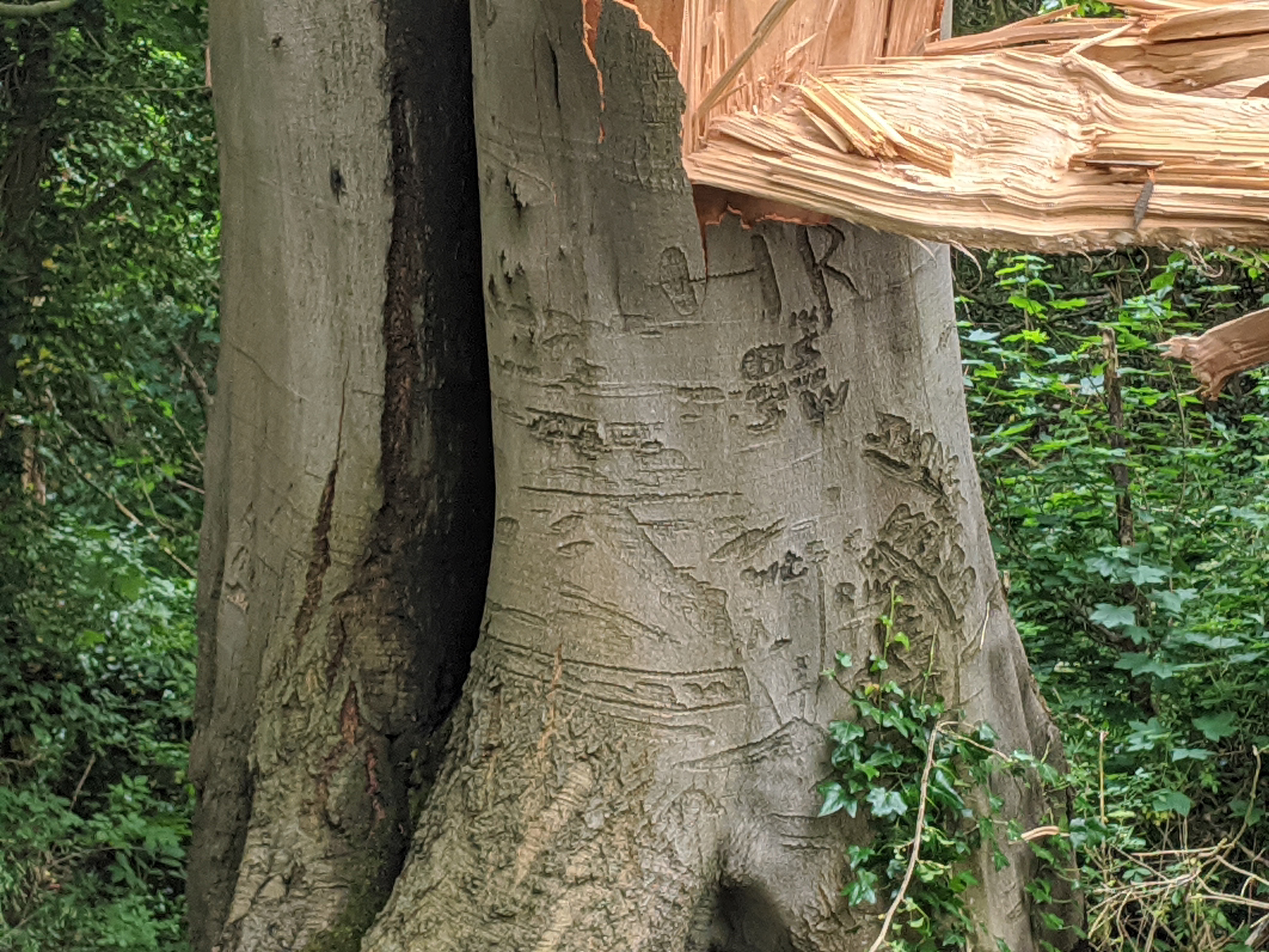 Dominating the oldest part of the woods was a beautiful pair of beech trees, two seedlings that grew up side by side, entwined, like siamese twins. The left one had a branch wrapped around the other - you can see it about three-quarters of the way up. Our tree surgeon guessed they are - were - roughly 150 years old.