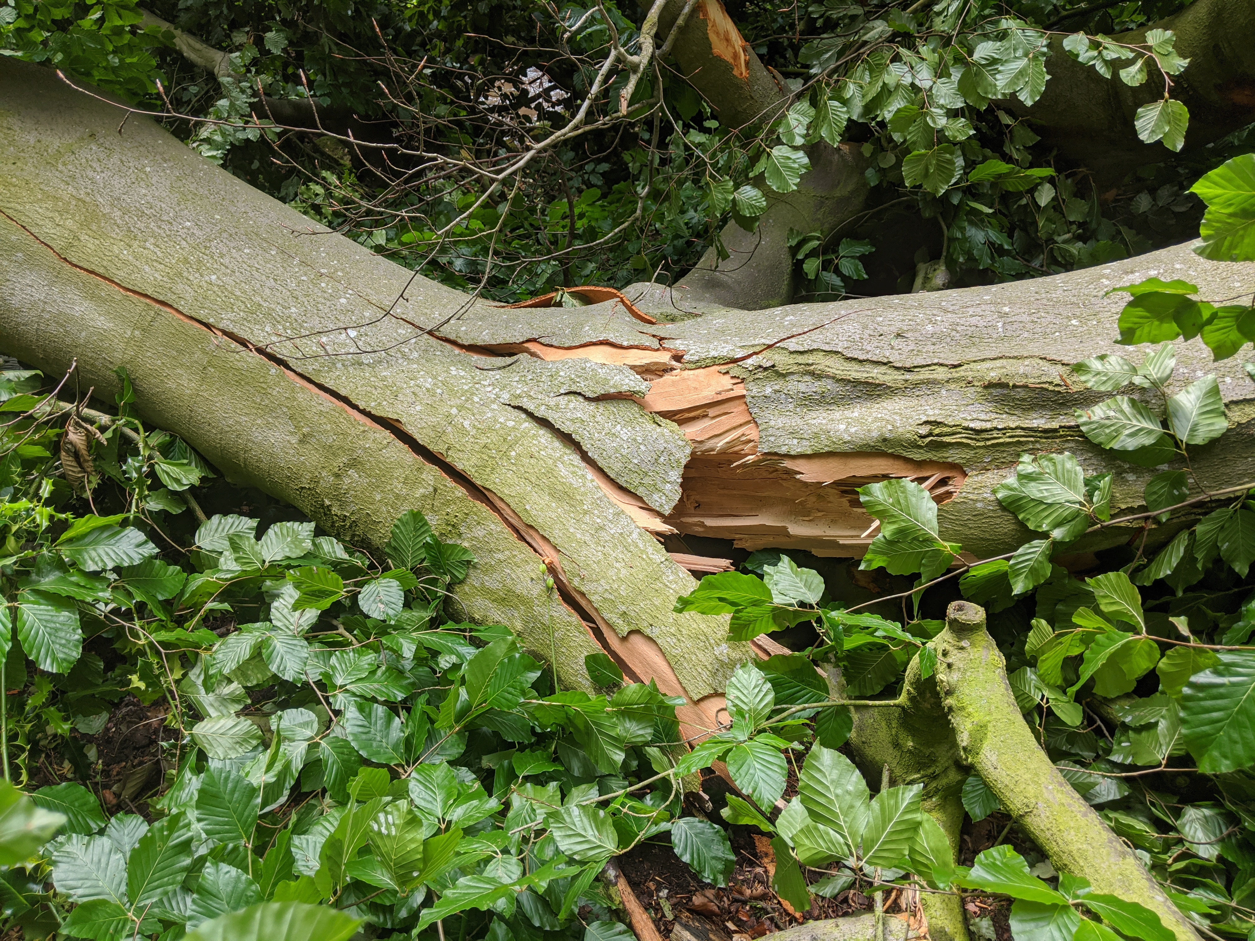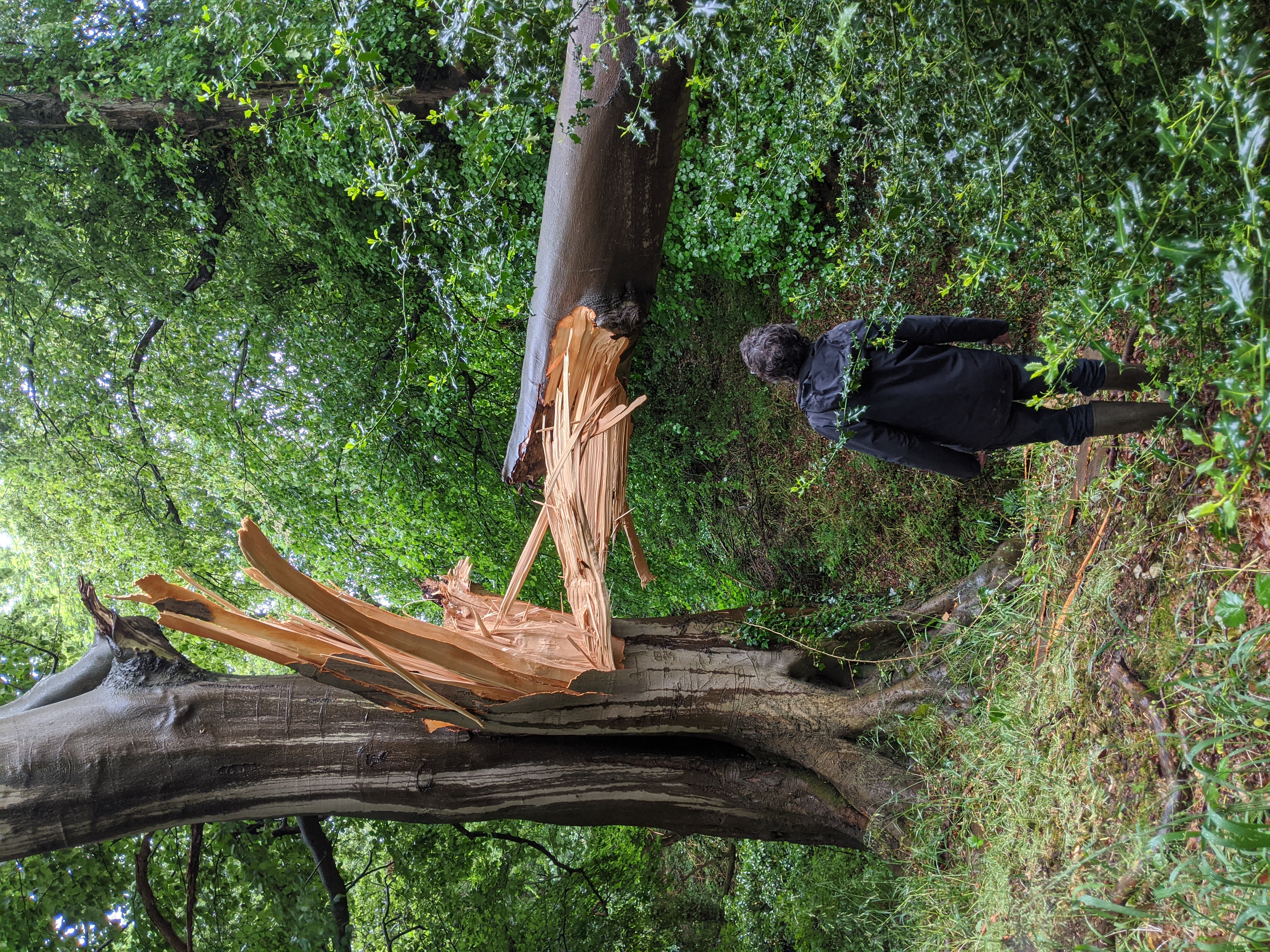The weather broke in June with an almighty storm. My phone pinged at around 4.30 am, pulling me from a half-sleep as rain smacked the window. It was Ben Ranyard who was on his canal boat next to the woods. All I could make out was a string of expletives and the sound of rain slapping on his coat. The tree had fallen in the night, its crown landing about ten metres from Ben’s boat. The sound, like an explosion, had woken him (and Flash). An hour later we stood in the weak light of a glittering, wet dawn, awestruck at the sight of the fallen tree hanging precariously over the stream. brutally torn off at the base.