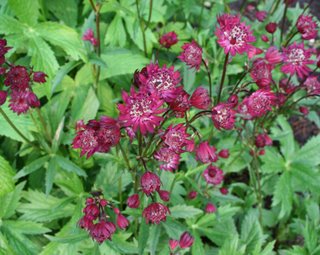 Astrantia 'Ruby Glow'. This border is turning into a mostly dark pink area with the peonies and the purple cotinus nearby