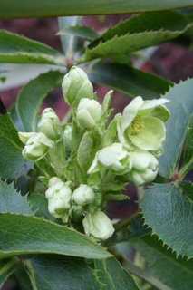 The Corsican hellebore, Helleborus argutifolius just starting its winter-long flowering spree.
