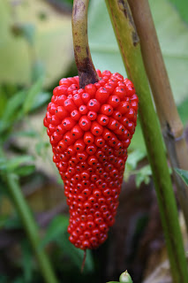 The hedgerows are lit up with red hawthorn berries and rose hips, but the most vibrant red in the garden is the scarlet seed pod of the Arisaema in the sundial garden. I'm leaving it as long as I dare before collecting the seeds - it is simply stunning.