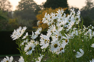 One of the loveliest plants in the garden waited until the visitors had gone for the year before revealing its beauty. Leucanthemella serotina is a simple white daisy, but with the faintest tint of lemony green and an ethereal luminescence about it which shines out in the low autumnal light. It is quite tall at about 5', but very upright and sturdy, forming a tight clump with all its blooms endearingly turned towards the afternoon sun. I'm quite capitivated by it.