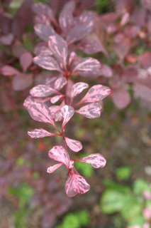 Berberis thunbergii 'Harlequin'. I love the mottled leaves of this pretty and trouble-free plant. Plus red berries which last into winter.