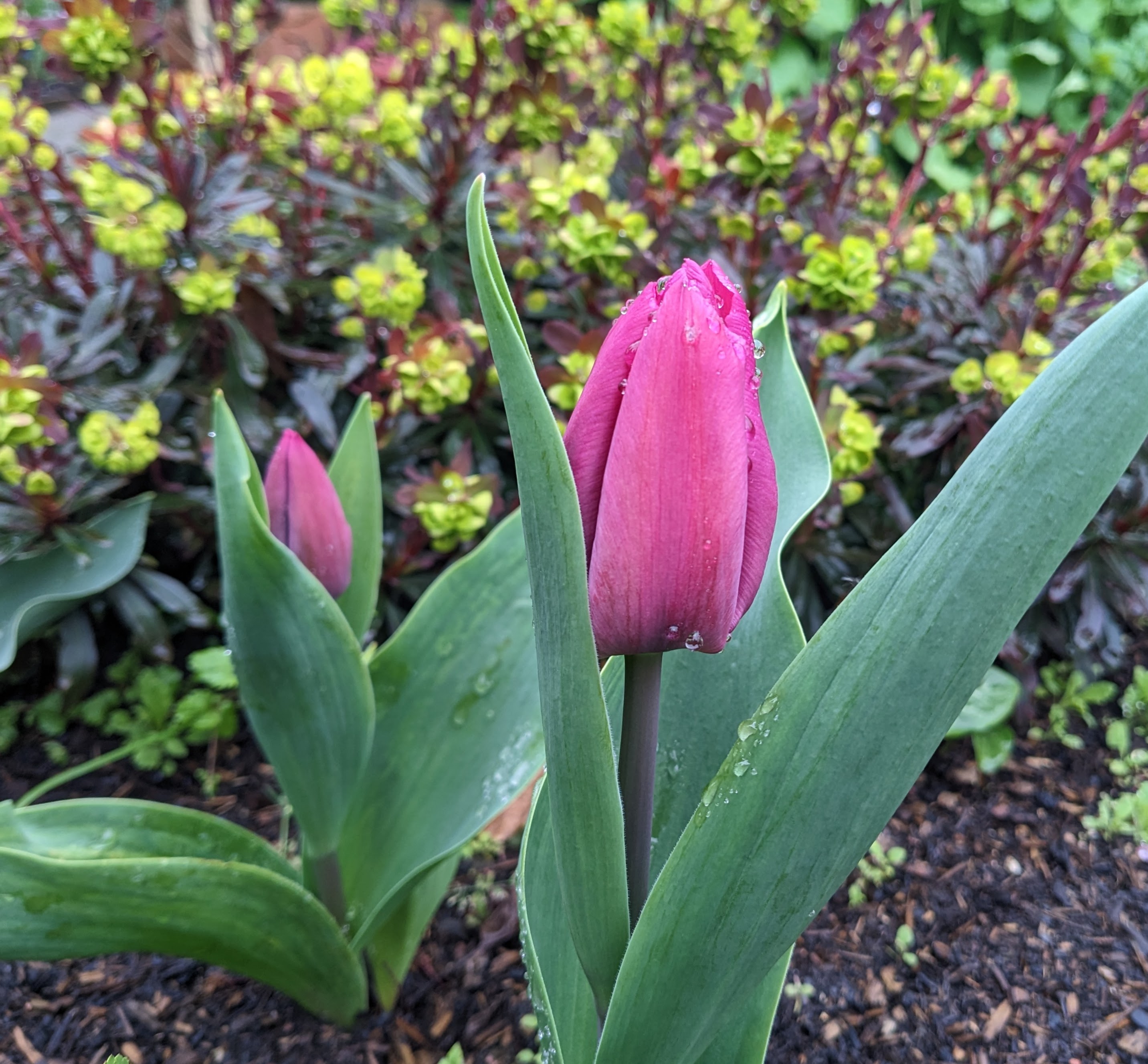 Orange and purple are meant to look good together so last autumn I planted Tulip ‘Purple Prince’ which has turned out to be a rich vibrant colour that I like very much, but it’s not purple, is it? Magenta, perhaps? It works perfectly with the zingy Euphorbia amygdaloides ‘Purpurea’ behind it, and with the fresh gold foliage of Hakonecloa macra ‘Aureola’ emerging nearby.