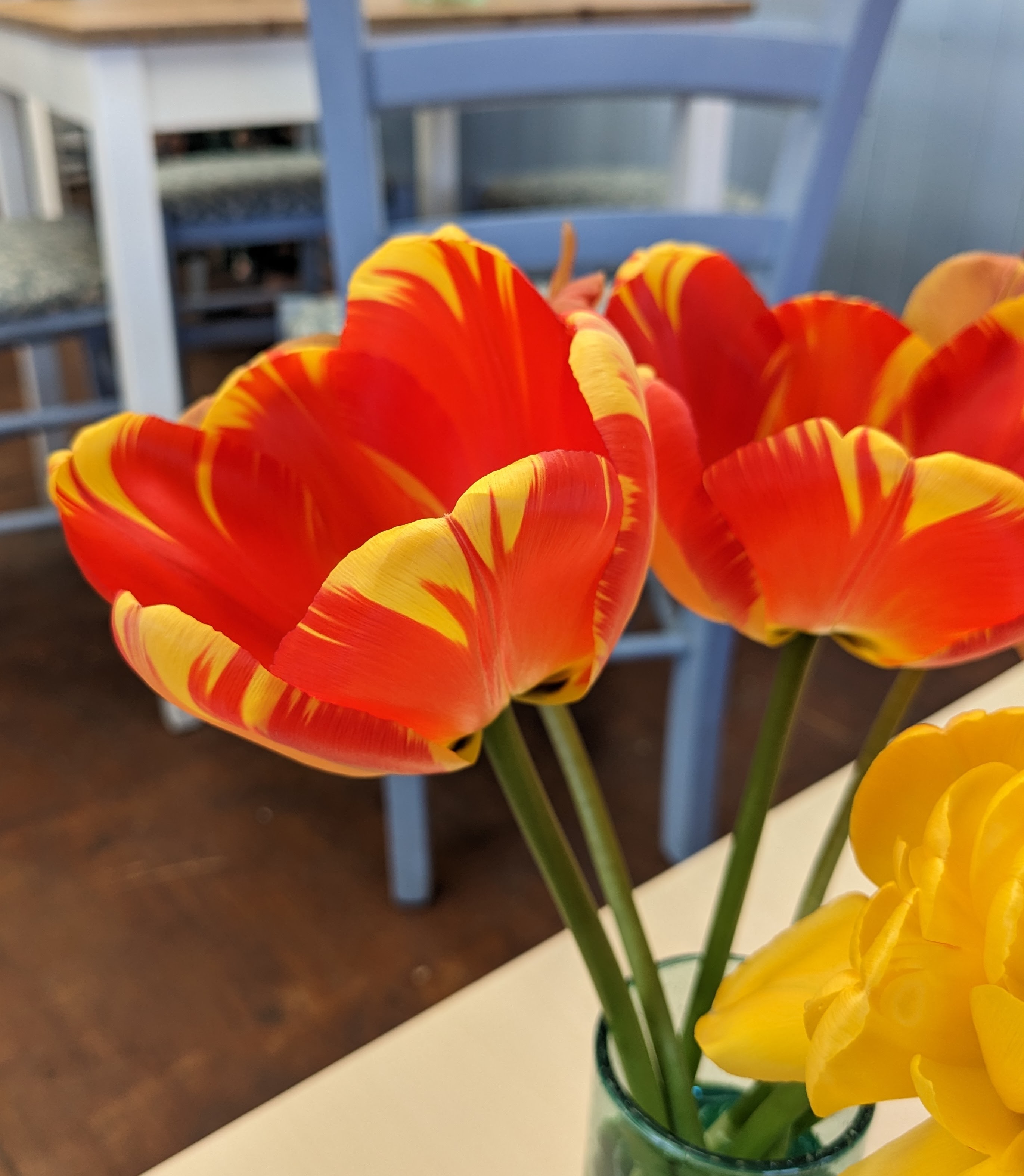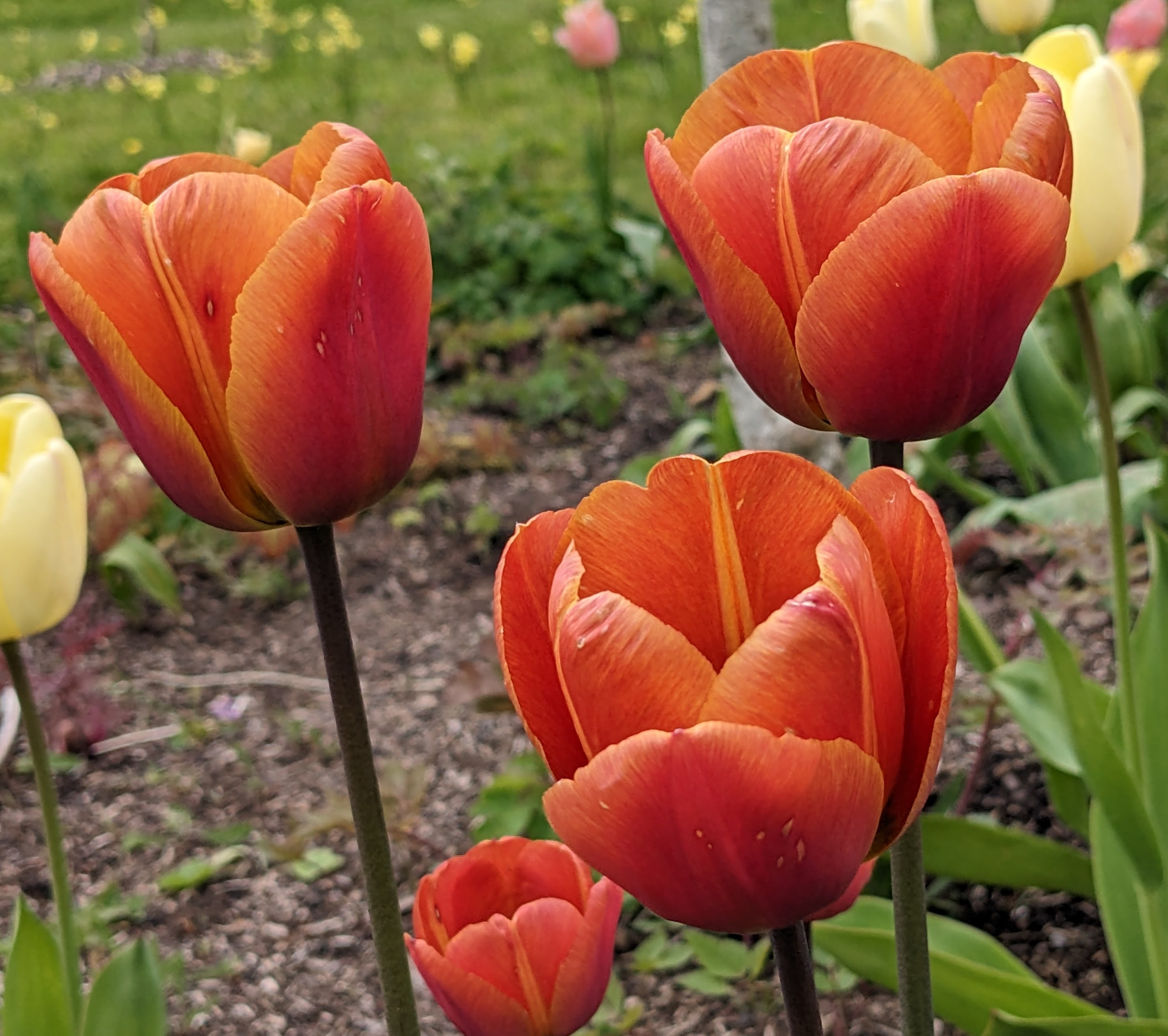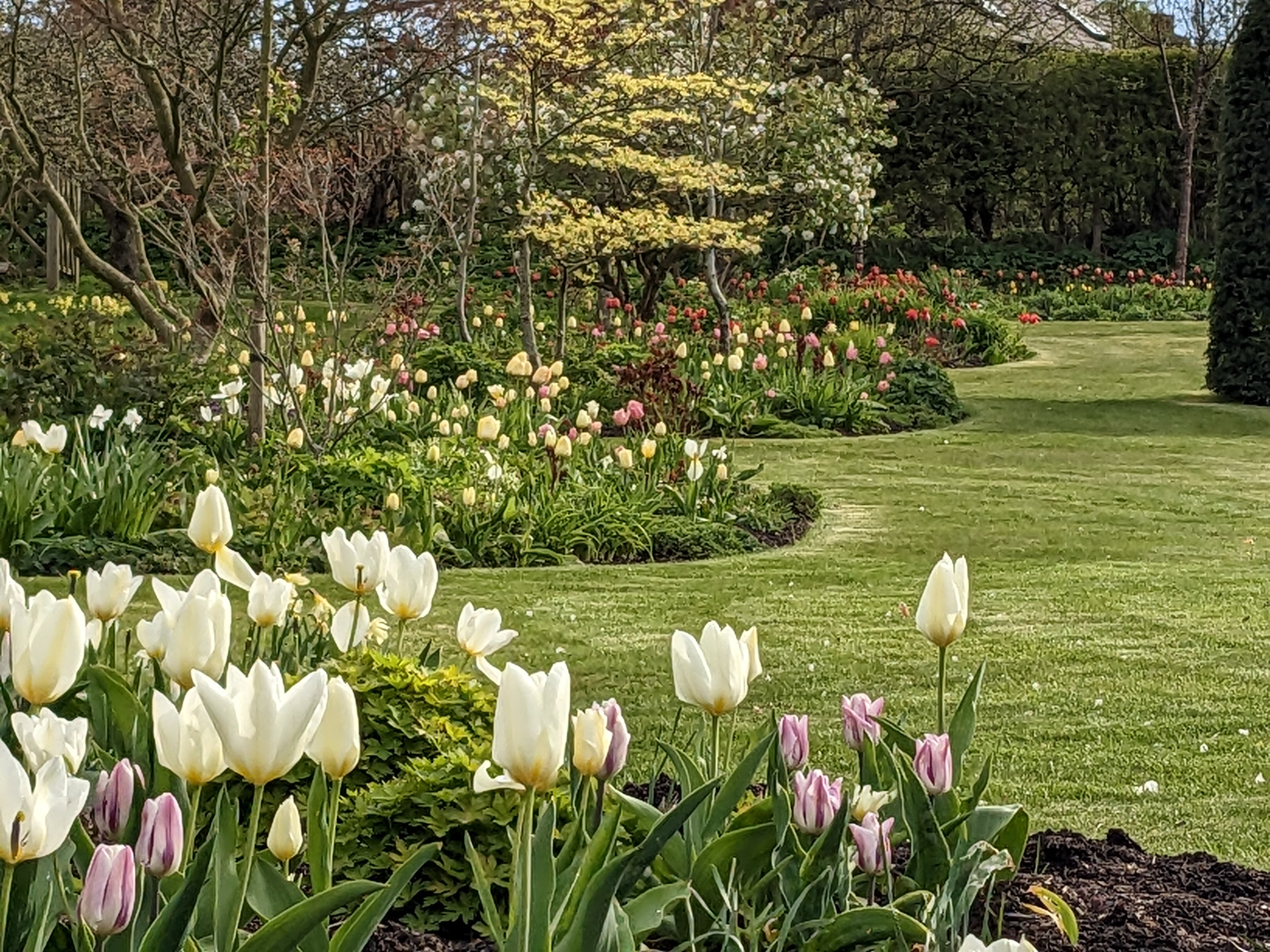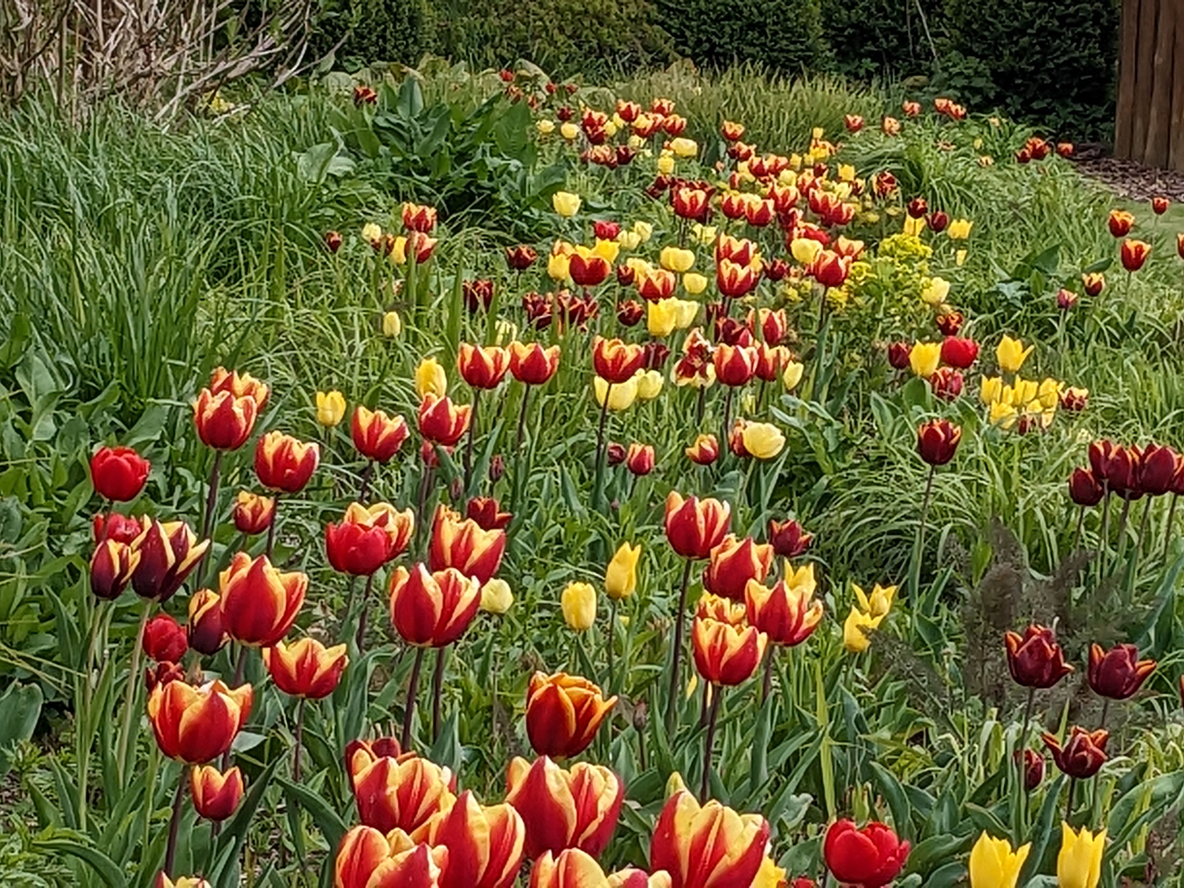 These otherwise unremarkable shrubs draw our vistors uphill, which then reveals more of the tulip displays behind the yew hedge. An old favourite for us is Abu Hassan with Makassar or whichever other good yellow I can get hold off. Without them, this emerging border of mid-season perennials and grasses would just be a sea of greens in April. I’m not really one for bling, myself, but I’m very happy to drape swathes of jewel-like colour through the emerging borders.