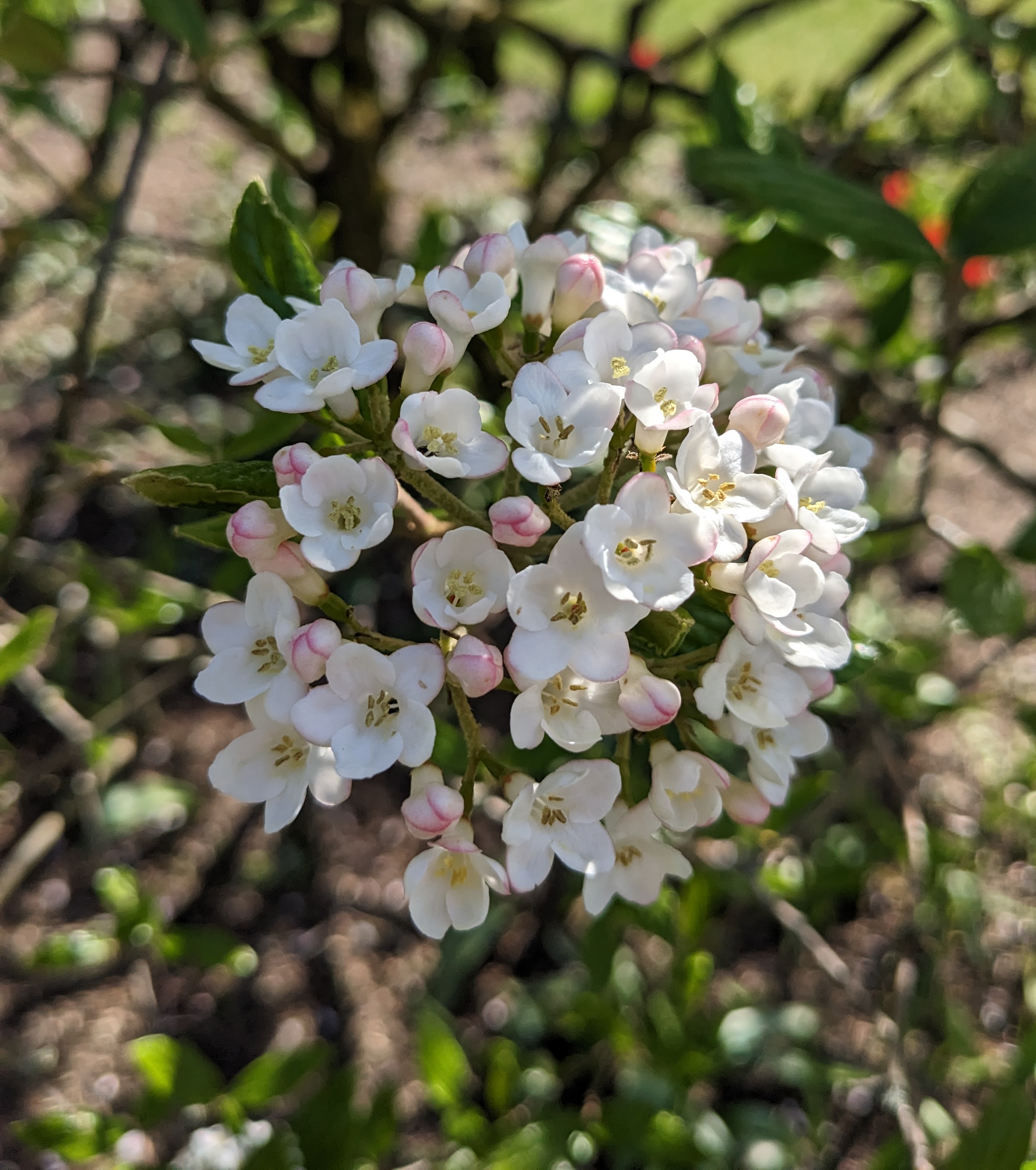 If their olfactory senses take them all the way, they’ll end up at a Viburnum - I think the one pictured above is V. carlessii, but we have V. burkwoodii too and both are phenomenally richly scented. The pink shrub on the right is a shrubby honeysuckle, Lonicera syringantha. It’s a scruffy thing, with thin, bitty branches, but it belts out its sweet fragrance across the whole garden.