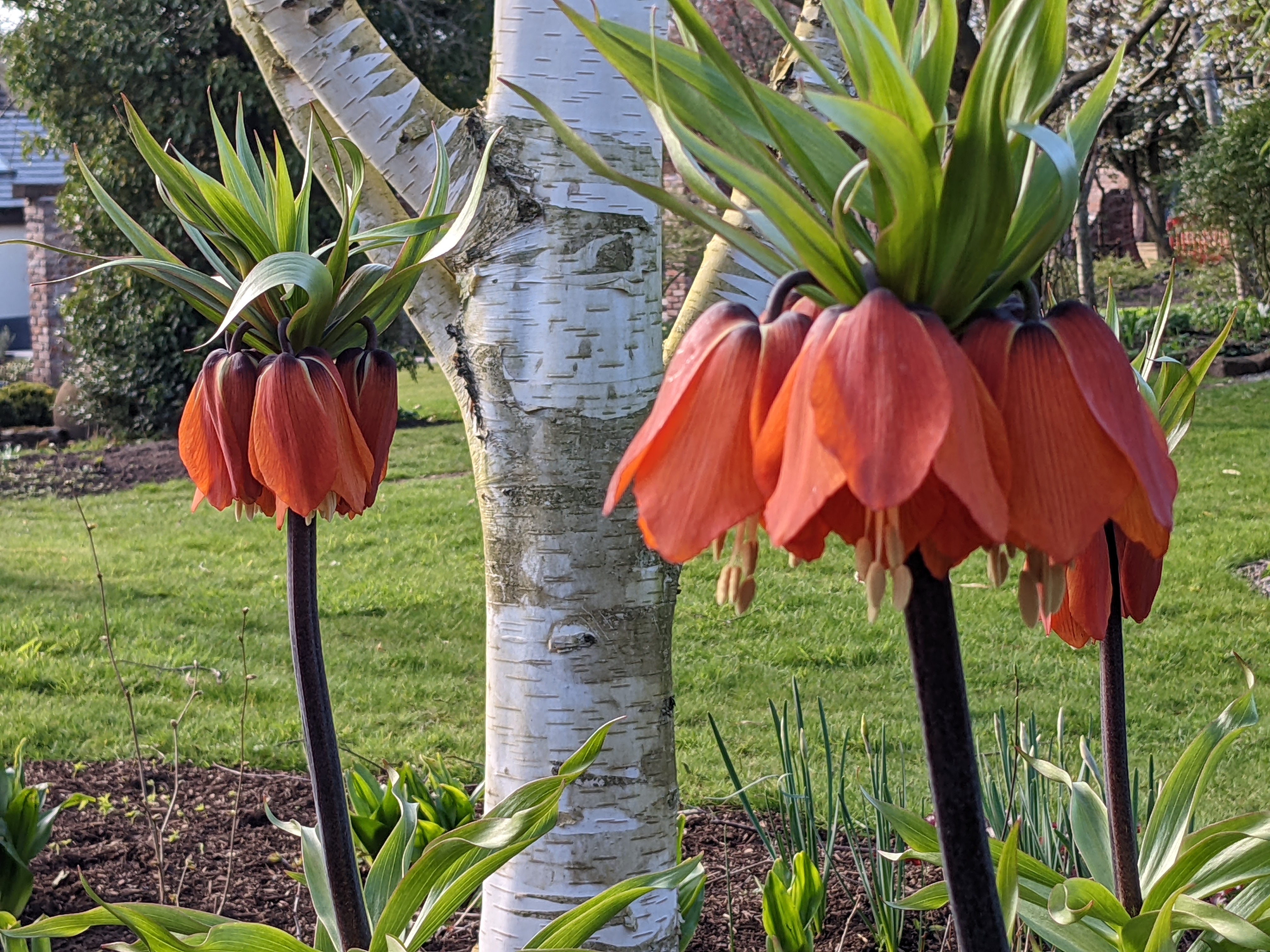 This colour combination is a complete accident - and one I will take full credit for. Sumptuous orange with pure white - what a knockout pairing it is. Despite the outrageously ruinous cost of these Imperial fritillary bulbs, I shall splash out on at least thirty of them this autumn to plant under the other birches to make a spectacular show.