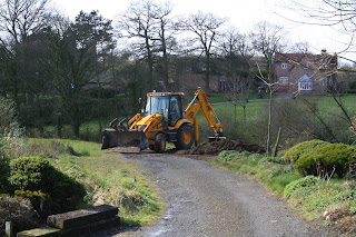 Today was manic. The JCB arrived first thing, complete with charismatic driver, Norman and 20 tons of motorway planings. Amazing how accurate that machine can be in the right hands - he could stroke a cat with it. Anyway, we now have a flat, firm parking area which I will finish with a fine coat of soil and grass seed. It'll be green again in no time.