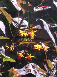 The crosmia arrived by itself. I cut the cotinus back hard every year to keep it shrub sized.