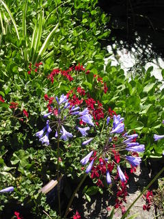 My reliable agapanthus and the Tatton pelargonium above the pond