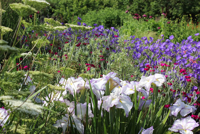 Turn to the right now and the picotee edges of 'Light at Dawn' echo the purple and magenta in Geranium 'Orion' and Lychnis coronaria. Many of these subtle combinations are accidental, but I've decided that spotting it and noting it for the future is as good as if it was planned all along....