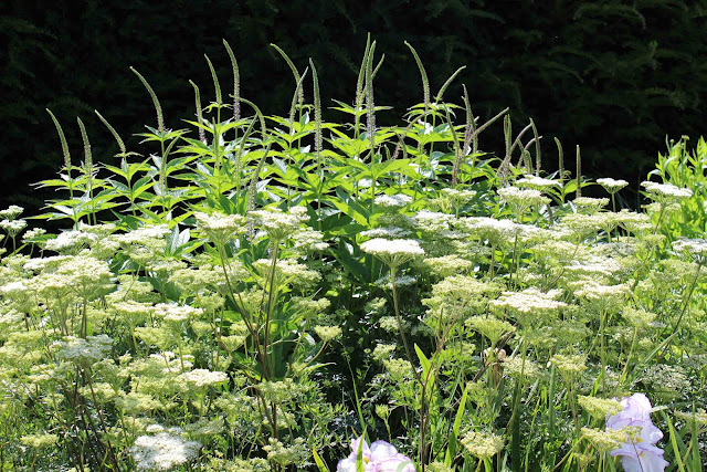 At the back are the elegant bud spires of Veronicastrum 'Fascination' against the seemingly black yew hedge. In the centre is a gorgeous umbellifer, Seseli libanotis. It's very long flowering, properly perennial and is sturdier, shorter and denser than Anthriscus. It's an all round better plant in my view. Right at the front is the top of a clump of Iris ensata 'Light at Dawn'.