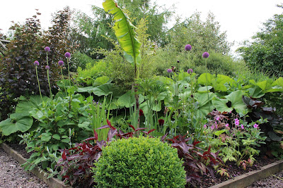 The theme was inspired by a visit to Great Dixter - the Musa basjoo in the centre was one of their cast-offs, generously (or perhaps gratefully) thrown into my little green van by Fergus Garrett and driven carefully back to Cheshire by me with its leaves flapping over the passenger seat. It's been outside for four years now, in temps down to -15C.