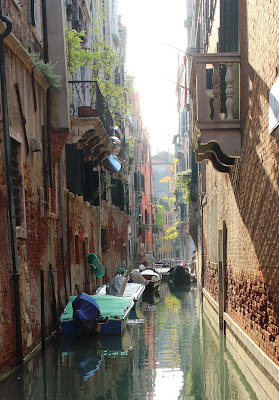 There, I've nothing much to add. Venice is like nowhere else on earth. How have I made it into my sixth decade before exploring its shimmering waterways ? I didn't know there are no roads at all on the island. I didn't know that if we got off the Vaporetto at the wrong stop we'd be bumping our suitcases for a mile over a dozen exquisite little bridges in the half dark. I didn't know it would be all but silent at night, but for the occasional Doppler-esque ebb and flow of footsteps on the pavement outside.