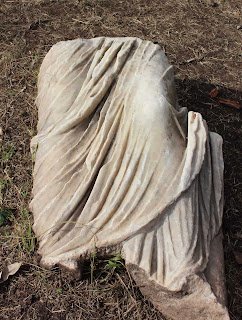 This delicate carving, plainly of a woman's legs draped in a fine fabric, lies amid ruins of a neglected Roman temple, next to the railway, squashed between a car mechanic workshop and a kitchen installer. A group of workmen were packing up their strimmers, otherwise it would surely have been buried in the long grass.