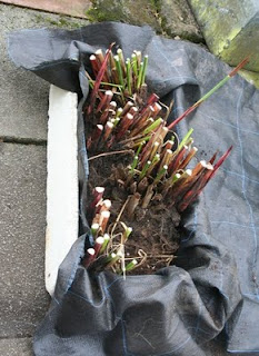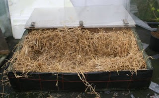 Cyperus papyrus, Colocasia Black Magic and Colocasia fontanesii - packed in trays of compost (the Cyperus is in a polystyrene frozen fish trough thingy, the others are in black nursery crates) in the greenhouse topped with straw. I keep the greenhouse just above zero with an electric heater.