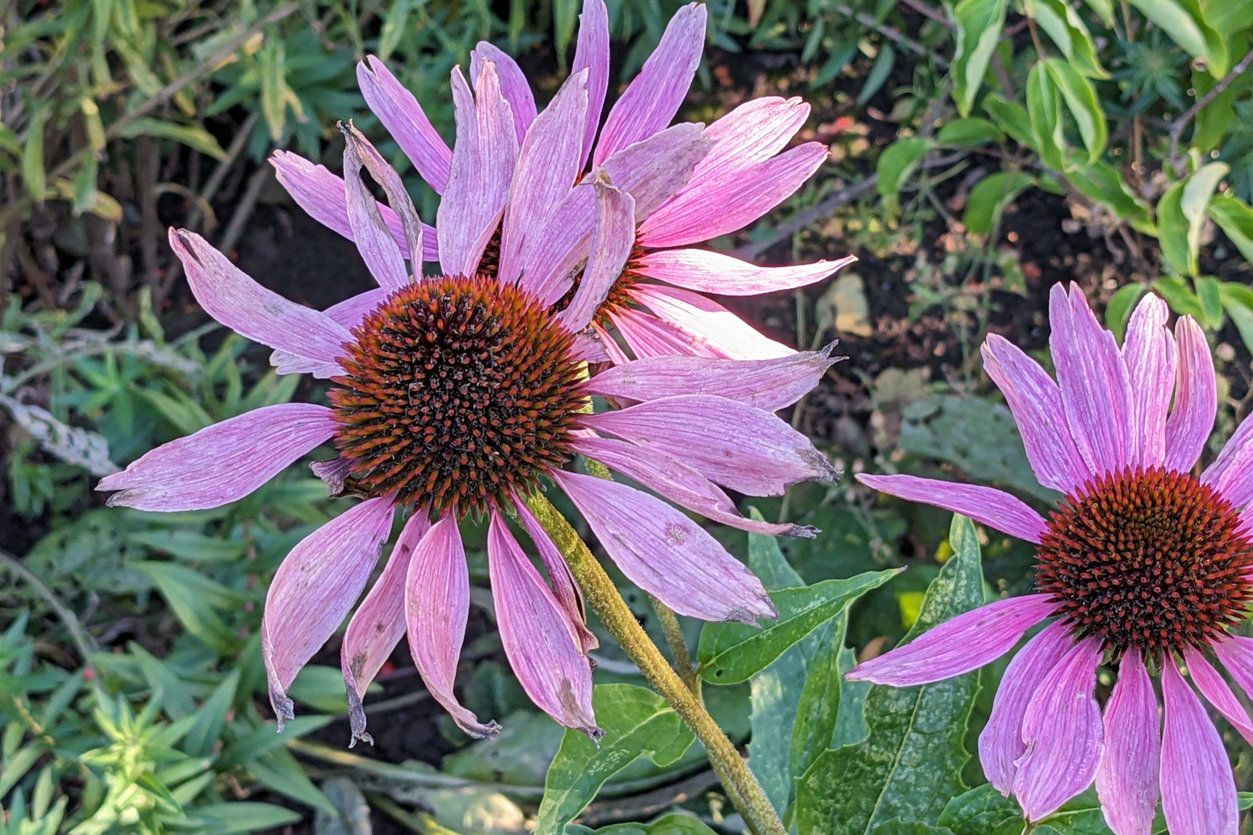 Others have been flowering for weeks, now slowly fading as the temperature drops. Echinacaea ‘Rubinstern’ opens crisply pink in July, each flower fading slowly over the weeks until they resemble old taffeta, weathered at the petal tips like a long silk gown trailed carelessly across the ground.