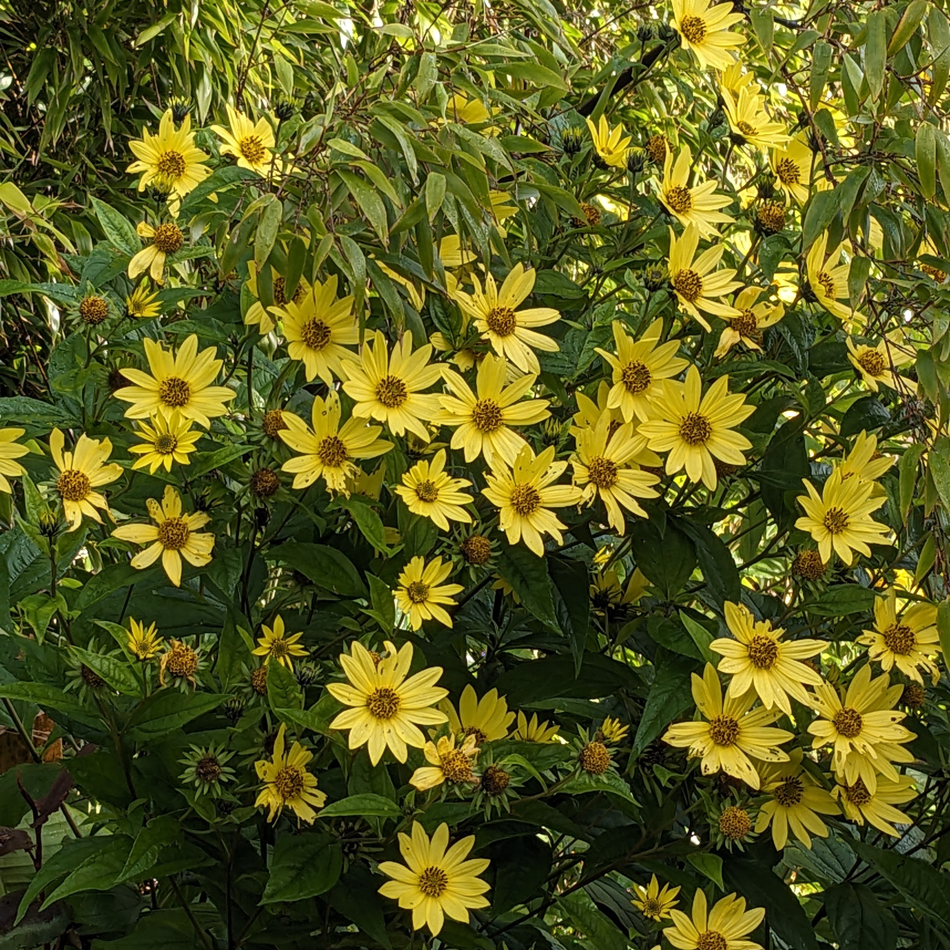 The first is Helianthus ‘Lemon Queen’. Tall, confident and smothered in smart flowers for at least two months, it oozes sunshine and cheerfulness. Ours is planted next to a black bamboo and the two seem to be very happy partners, quite the equal of one another.