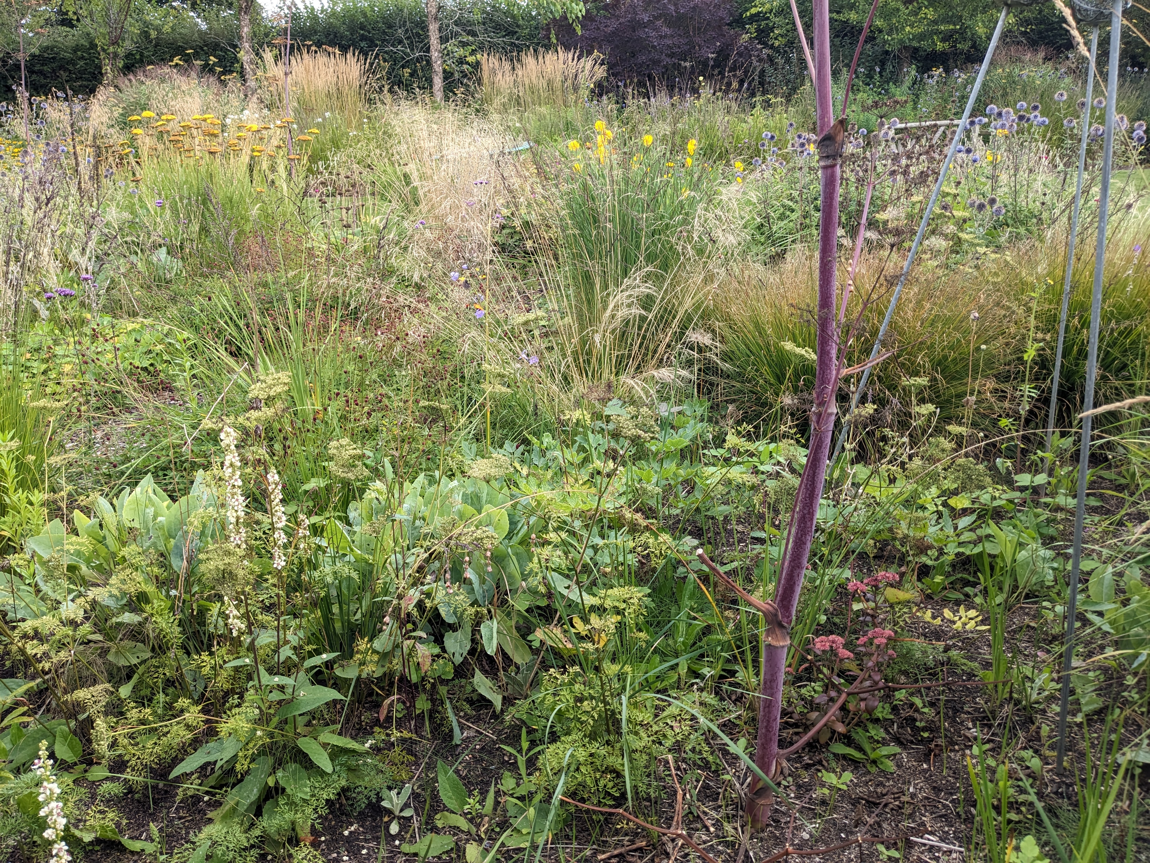 The area pictured above has completely lost it. It’s actually just to the right of the top photo - the tall pink stems of Peucedanum verticillare in the foreground above are the same ones on the far right of the top picture. I’ve cropped this area out - it’s just visual mush. Still visible are the glaucous leaves of the Rudbeckia maxima that I planted originally, now congested and not flowering, and the ferny fronds of a lovely self-seeding umbellifer, Cenolophium denudatum. Amongst them, Verbascums, a sedum I didn’t plant, lots of Dierama seedlings, a reed of some sort, several grasses and lots of weeds.