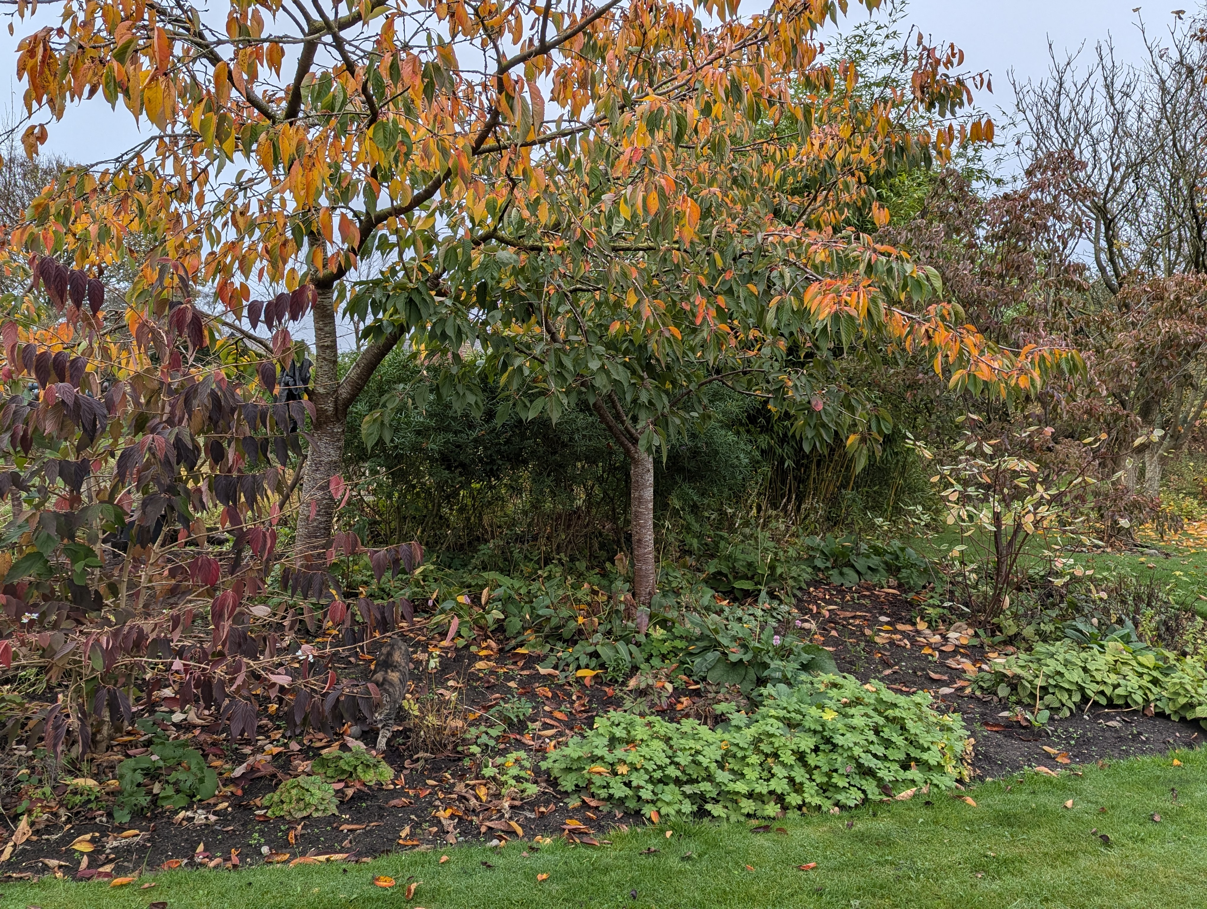 That was last Thursday. This Thursday we moved on to another border from which we’ve been trying to clear ground elder for a couple of years. One huge, impenetrable mat of roots remains, under the four Choisya ternata ‘Aztec Pearl’ that I planted 10 years ago to form a scented screen for the seat beyond. But as well as being riddled with ground elder, they’re growing up into the Prunus ‘Shirotae’, above them, marring their shape. And I don’t want to prune them into blobs. Also, I’d quite like to be able to glimpse through the cherries to the pond beyond it. So no prizes for guessing what next Thursday’s task is…