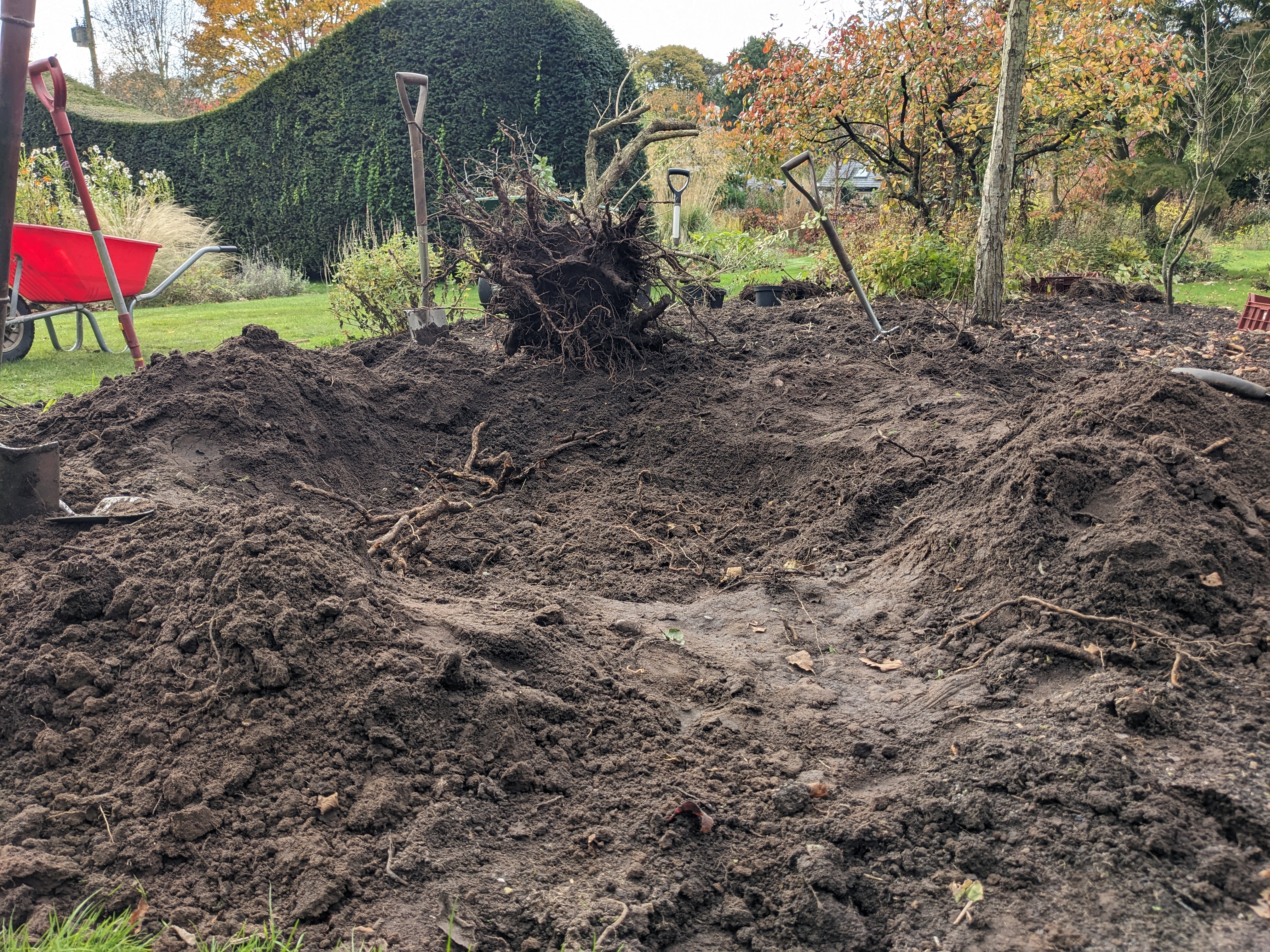 So Chris and I agreed it needed to come out. It’s been in at least 30 years and was reluctant to relinquish its spot. But over the years we’ve defeated mightier foes together and we have our ways. We’re both in our 60’s now and we don’t rush at it. First, we prune it to about waist high. We gather up trenching spades, trowels and loppers and start to dig steadily, working our way round and under it, one section at a time. Chris’s knees aren’t great, so she stands up and digs. I don’t like bending double so I kneel down, burrowing underneath with a trowel to expose and sever roots one at a time.